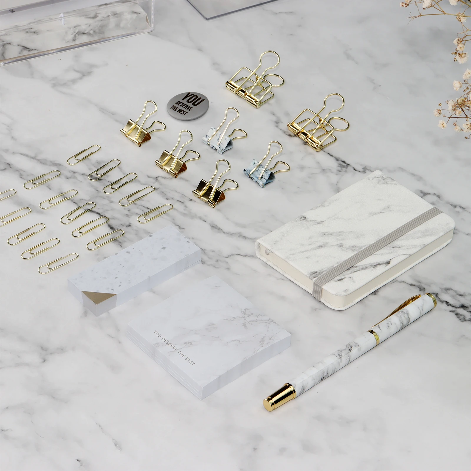 1. В комплект входит: 1 металлическая авторучка/Шариковая ручка; 2 блокнота разных размеров; 1 журнал Mni; 75 золотых скрепок 28 мм; 2 скрепки из Золотой стали 32 мм; 5 шт. marble N gold19mm скрепки, 6 практичных и координатных элементов в общей сложности. 2. Изысканный дизайн: элегантный мраморный белый тон, милые элементы океана. Превосходное качество, долговечность, защита от ржавчины и повторное использование. Великолепные аксессуары для стола, простые и стильные. 3. Применение: 8 различных видов предметов в одном наборе, домашний офис или школьные принадлежности, стационарный набор. 4. Подарочный набор: упакован в прозрачную подарочную коробку, самостоятельный или гениальный подарок студенту, сотруднику, друзьям или семье и т. д. подходит для мужчин, женщин и детей. 5. Посылка: качественный акриловый прозрачный Органайзер позволяет четко видеть предметы внутри. Multibey предлагает 100% гарантию соответствия, пожалуйста, приобретайте с уверенностью.