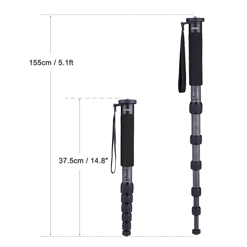 Andoer C-555 монопод, с его сильной структурой, грузоподъемность до 10 кг/22 фунта. Это делает его не только моноподом, но и походной палкой для путешествий на открытом воздухе. 6-секционный раздвижной дизайн, максимальная удлиненная длина 155 см/5,1 фута; поставляется с сумкой для переноски.