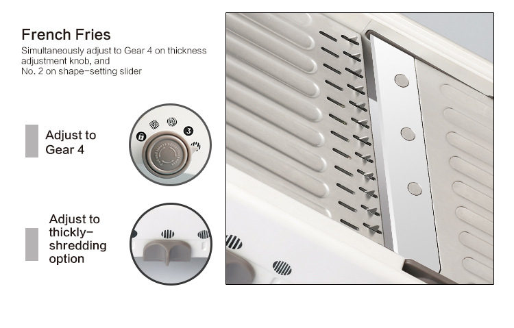 Особенности: 4 регулируемые толщины нарезки, 2 julisne (тонкая и французская Жарка) и 1 вариант нарезки вафель