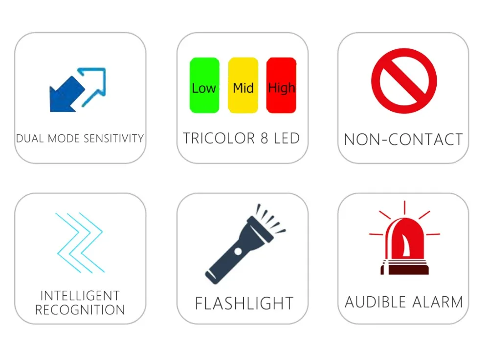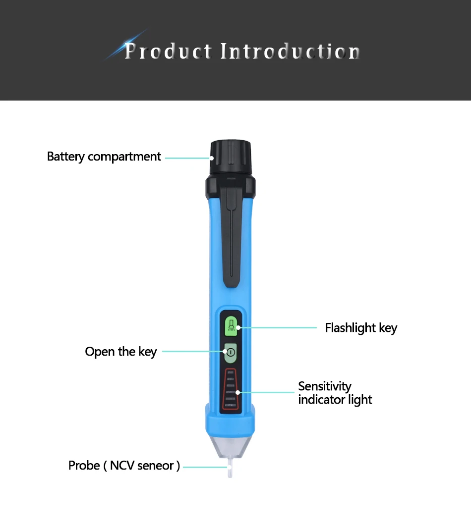 1. Бесконтактный и тонкий дизайн, удобный в эксплуатации и переноске. 2. Супер-чистый дисплей EBTN, прозрачный и легко читаемый. 3. Два режима работы. (низкая чувствительность и высокая чувствительность) 4. С индуктивной опасной сигнализацией напряжения, различием между живыми и нейтральными линиями, позиционированием в реальном времени, проверкой непрерывности, функцией фонарика и т. д. 5. ЖК-дисплей и светодиодный индикатор с двумя подсказками-опасное напряжение с первого взгляда. 6. С 8 светодиодный индикаторами в 3 цветах (красный/желтый): Автоматическая идентификация высокого/среднего/низкого напряжения. 7. Режим сигнализации: звук, аналоговая полоса и светильник (красный/желтый). 8. Двойной изоляционный материал тела значительно улучшает стандарт безопасности, чтобы защитить вас от электрического удара. 9. Уровень безопасности: CAT II 600V. 10. Напоминание о низком напряжении батареи, функции автоматического отключения питания.