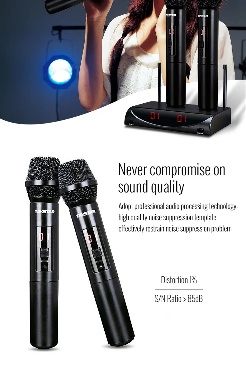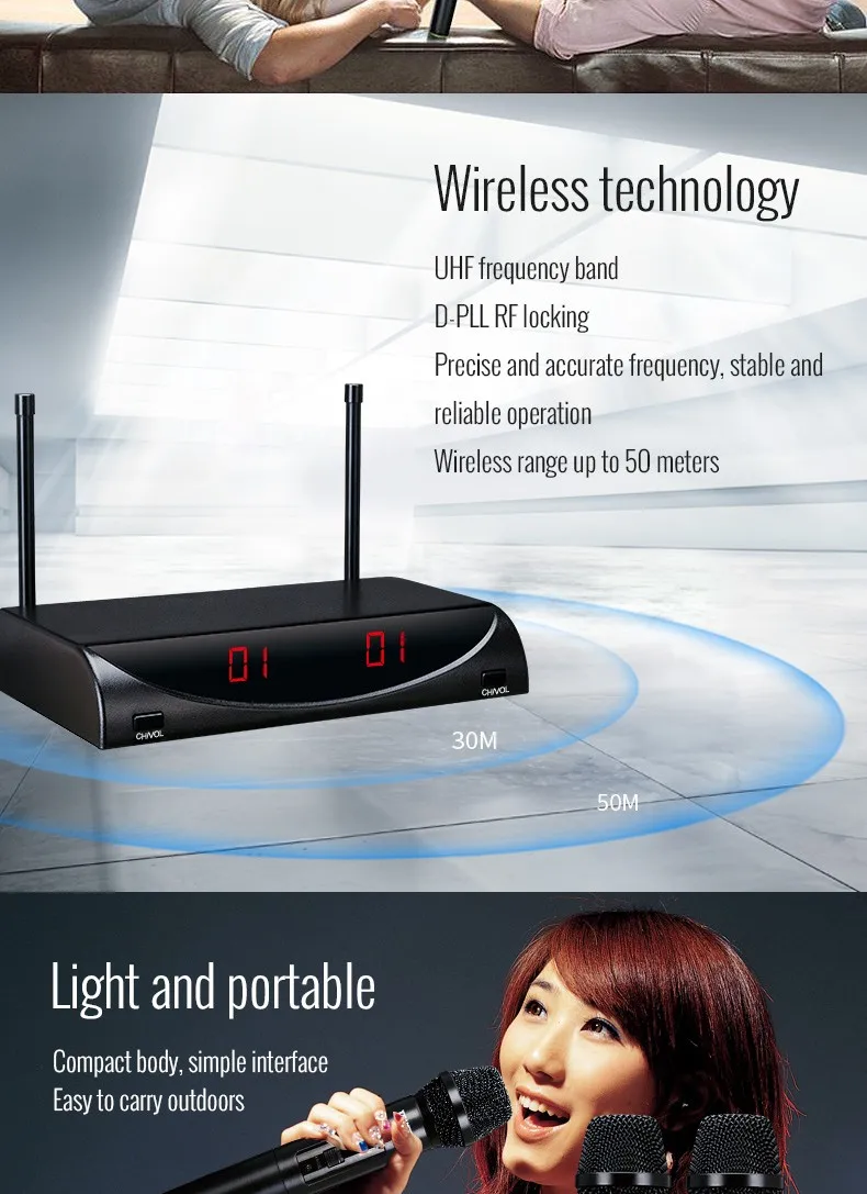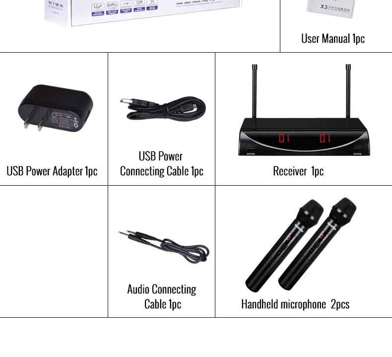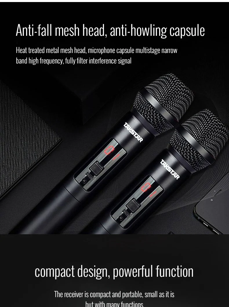 Features:• UHF wireless microphone dedicated frequency band design avoids other industrial frequency interference• D-PLL RF frequency lock technology for accurate frequency and stable performance• Professional audio companding technique for reducing the noise and increasing the dynamic range• Long operating range up to 50m in open area• Transmitter is powered by 2pcs 1.5V batteries for easy replacement• Advanced pilot signal lock function can better avoid interference and eliminate the on/off mechanical noise• Mixed (6.35mm) output for convenient connection with the audio processing and amplifier equipment• Receiver adopts USB power interface which can be conveniently powered by various devices with USB function directlyApplication:Classroom, home entertainment, multimedia applications, outdoor activities, KTVSpecification:• Frequency Range: 740MHz-790MHz• Modulation Mode: FM• Number of Channels: 16(R)+16(L)• Frequency Steadiness: ±0.005%• Sensitivity: -85dBm• Transmit Power: <10mW • Frequency Deviation: ±45kHz• Frequency Response: 60Hz-15kHz • S/N Ratio: >85dB(A+)• Total Harmonic Distortion: <1%• Operating Range: 50m in open area• Transmitter Power Supply: 3V(2pcs AA batteries)• Battery Playtime: Approx. 10hrs(depending on the battery)• Receiver Power Supply: DC5V/500mA (USB)• Output Type: Unbalanced mixed outputProduct Content:Receiver 1pcTransmitter 2pcsAudio Connecting Cable 1pcUSB Cable 1pcUSB Power Adaptor 1pcAntiskid Ring 2pcsPackage: color box