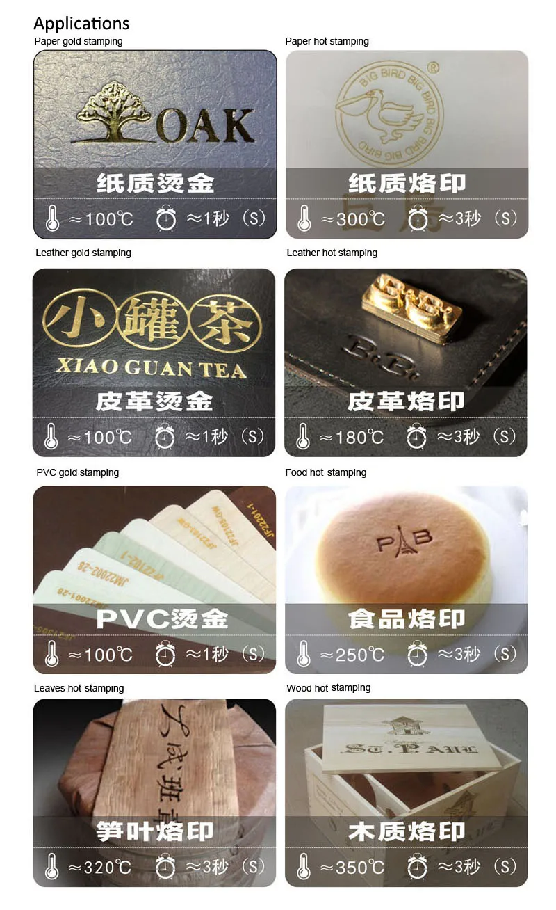 Применимо к: кожа, ПВХ, ПУ, визитка, бумага, пластик и другие материалы (золото или горячее тиснение); Дерево, листья, хлеб, и т. д. (горячее тиснение).