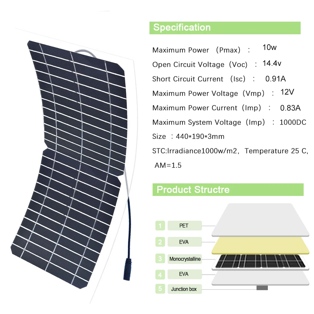 Максимальная мощность (Pmax): 10 Вт Холостого хода Напряжение (Voc) : 7,2 V Ток короткого замыкания (Isc): 1.82A Максимальное напряжение питания (Vmp): 6 В Максимальный ток мощности (Imp): 1.66A Максимальное напряжение системы (Imp): 1000DC Размер: 440*190*3 мм STC:lrradiance1000w/m2, температура 25 C, AM = 1,5