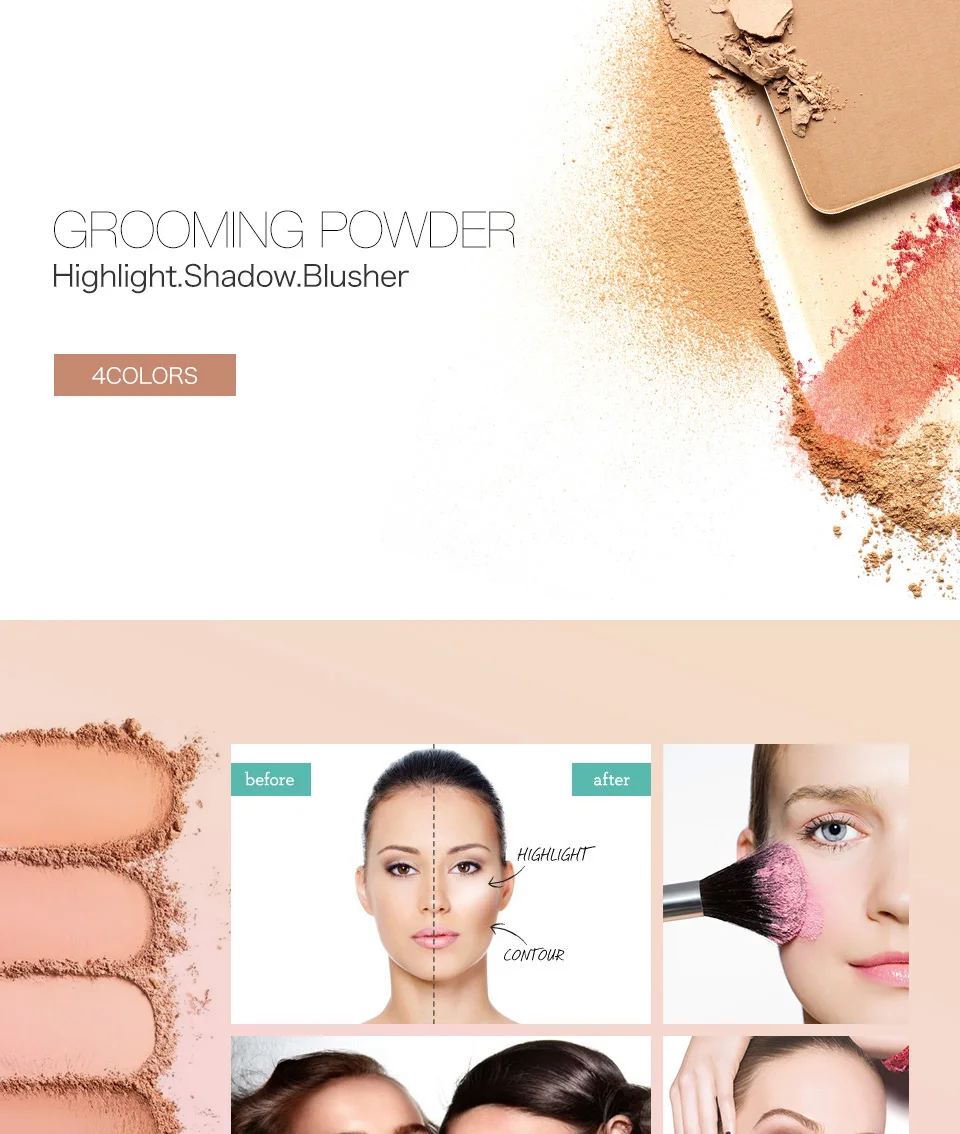 Многоцелевой, может использоваться как румяна, контурный порошок и компактный порошок;