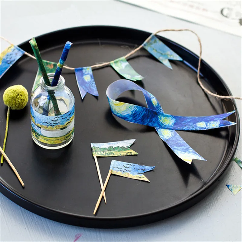 100% новый и высокое качество Уникальный дизайн, принт с известными картинами Ван Гога Яркий цвет, отлично подходит для скрапбукинга DIY, подарочная упаковка... Размер: (S): 1,5 см * 7 м Материал: бумажная лента Цвет: как на картинке Комплект поставки: 1 х лента Washi