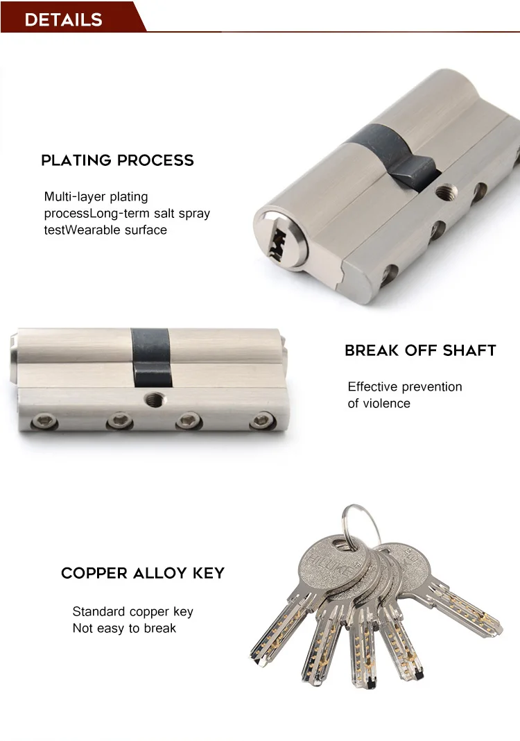 70 мм все медные разрывные двойной открытый цилиндр замка; Он может защитить цилиндр замка и эффективно предотвратить насильственное разблокирование Вспомогательное оборудование продукта: Одна Подарочная коробка, один цилиндр замка и Пять клавиш, один винт