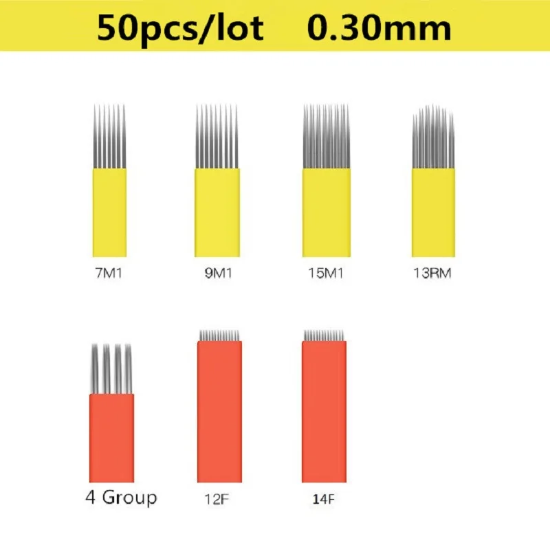 Цвет: как показано на картинке Используется для: ручного микроблейдинга бровей Особенности: Иглы особенность: (1) превосходное качество и соответствует международным косметологическим и санитарным требованиям. (2) Стерилизация сертифицирована гамма-лучами, соответствует национальным инструкциям по стерилизации. (3) игла изготовлена из медицинской нержавеющей стали. (4) Отличная стабильность, меньше вибрации. (5) только для одноразового использования. (6) Индивидуальная упаковка. (7) Доступные размеры: 7M1/9M1/15M1/12CF/13RM/4Group Список Пакетов 50 шт. мануального татуажа бровей Иглы