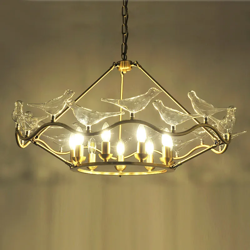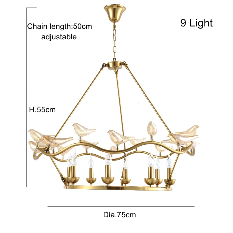 1 PCS 6 head /9 head creative American copper Pendant light for Living room shop Cafe Bar and clear glass bird Specification American creative Modern copper LED pendant light Light size:6 head Dia.60cm x H 50cm 9 head Dia.75cm x H 55cm Light source:E14 6W warm white 3000K ,pure white 6000K ,AC85V-240V input Material: copper body and glass Body color:copper orignal color Chain length:0.5 meter adjustable Application: Hotel,Hall Teahouse Tea Bar Home Decor Lighting Fixture living room pub Package include: 1PCS copper pedant Light E14 LED Lamp