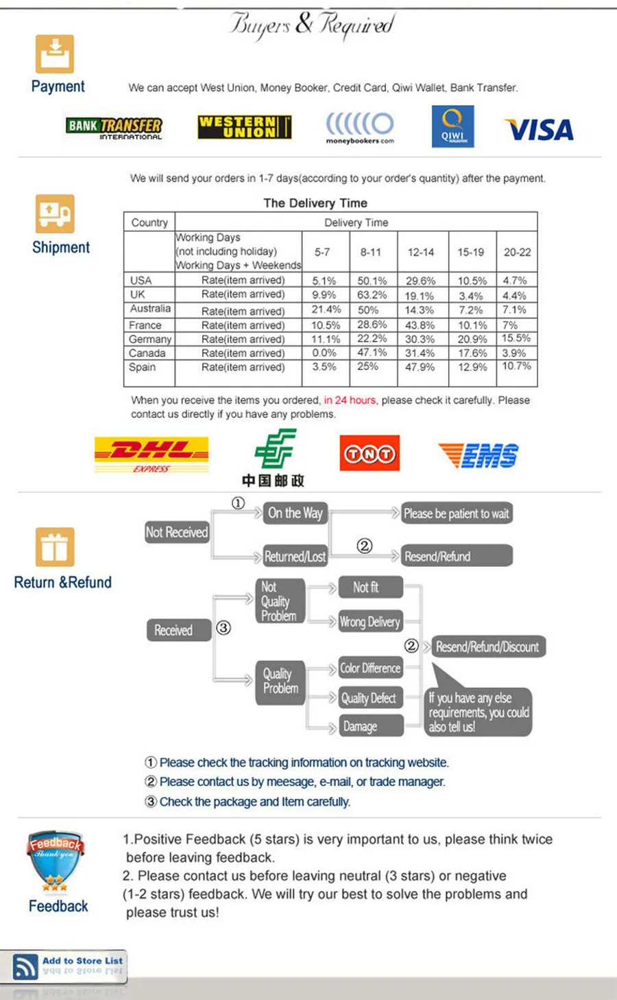 1. Время подготовки: нам нужно 3-7 рабочих дней для подготовки вашего заказа. 2. Мы выберем лучшую и быструю доставку для вас, поэтому иногда, если вы выбираете Почта Китая почту/ePacket, возможно, мы отправим вам по-разному. 3. Пожалуйста, подтвердите правильность информации о доставке при размещении заказа. Пожалуйста, напишите свое полное имя.