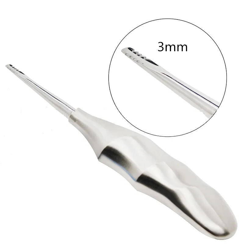 Использование этого стержня не требует рычага вертикальной силы. Конструкция такой сабельной головки пилы облегчает вставку шпильки в пародонтальное пространство и создает сопротивление корню при поднятии. После вставки пинцета между альвеолярной костью и корнем выполняется небольшое вращение и подъем. С помощью одностороннего сопротивления перевернутых зубов к корню, корень может быть легко удален.