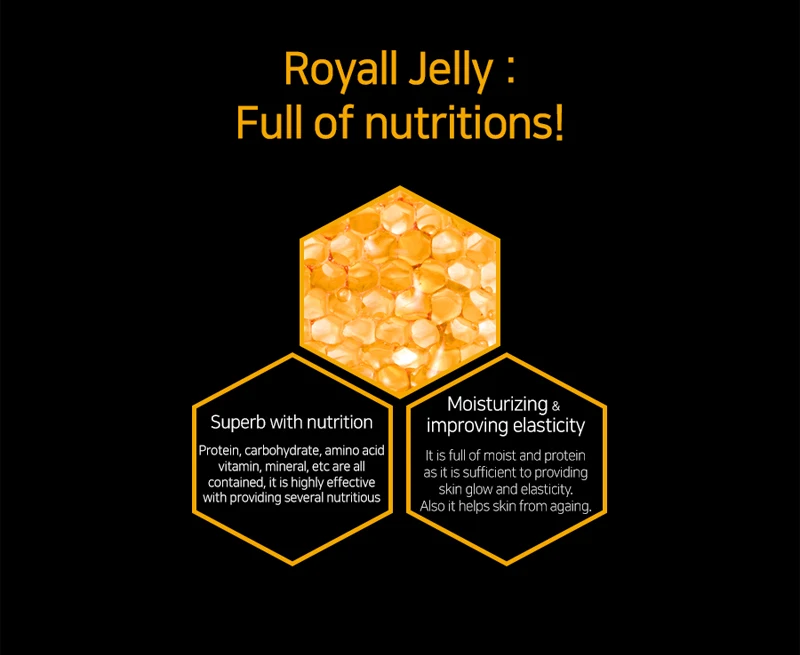 1. Натуральная целлюлозная маска: натуральная целлюлозная маска содержит Медовое питание, и это очень светильник, легко наклеивается на лицо. 2. Эффект гармонии между листом маски и эссенцией: натуральный лист маски целлюлозы высоко выполняется, когда содержит экстракт прополиса. Эффективно обеспечивает питание. 3,2 различных типов прополиса и маточного молочка: зеленый прополис, прополис и маточное молочко заряжает вашу кожу, давая увлажнение, это помогает вам иметь медовый блеск, как кожа.