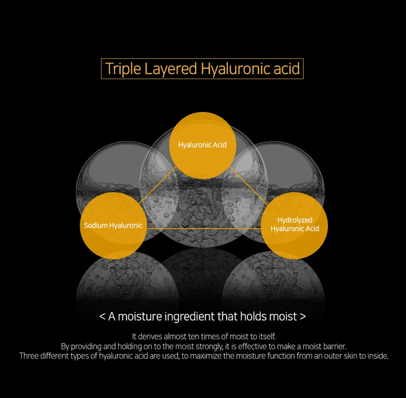 * Почти в десять раз увлажняет себя. * Путем и держится на влажной сильно, он является эффективным средством для того, чтобы сделать влажный барьер. * 3 различных типа гиалуроновой кислоты используются, чтобы максимизировать функцию влаги от внешней кожи к внутренней.
