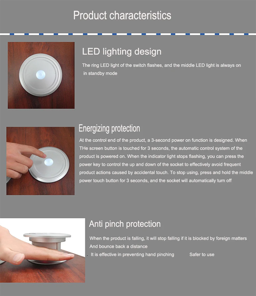 При контроле конца изделия, в течение 3 секунд кнопка включения функция предназначен. Когда Кнопка экрана трогается в течение 3 секунд, автоматическая система управления продукта включена. Когда светильник индикатора перестает мигать, вы можете нажать кнопку питания, чтобы контролировать вверх и вниз гнезда, чтобы эффективно избежать частых действий продукта, вызванных случайным прикосновением. Чтобы прекратить использование, нажмите и удерживайте сенсорную кнопку средней мощности в течение 3 секунд, и розетка автоматически повернет защиту от защелки.
