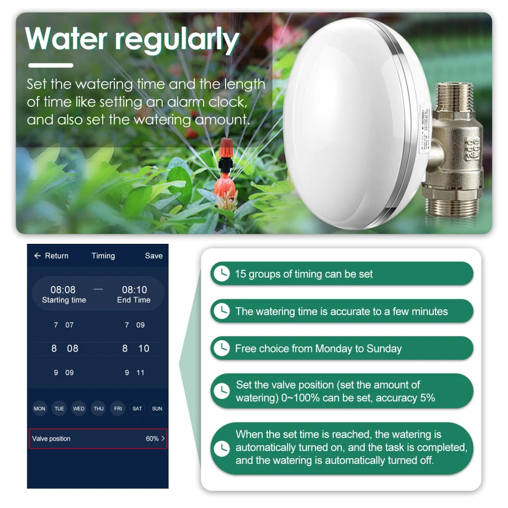 1. Используя этот многофункциональный интеллигентая (ый) для полива и орошения контроллер, вы можете подключиться к Wi-Fi через приложение для загрузки приложения. Независимо от того, где бы вы ни были, вы можете использовать свой мобильный телефон для управления открыванием или закрытии водопроводный кран с одной кнопкой, отображения и управления полив раз, комплект автоматического полива, обратная связь в текущем состоянии в режиме реального времени, а также регулировать размер потока воды (0 ~ 100%) точность (5%), полив по запросу в соответствии с погодой, датчик температуры и влажности, годовое резюме, основанные на голос полива освобождает руки, у вас 24 часа для полива сада ключница.