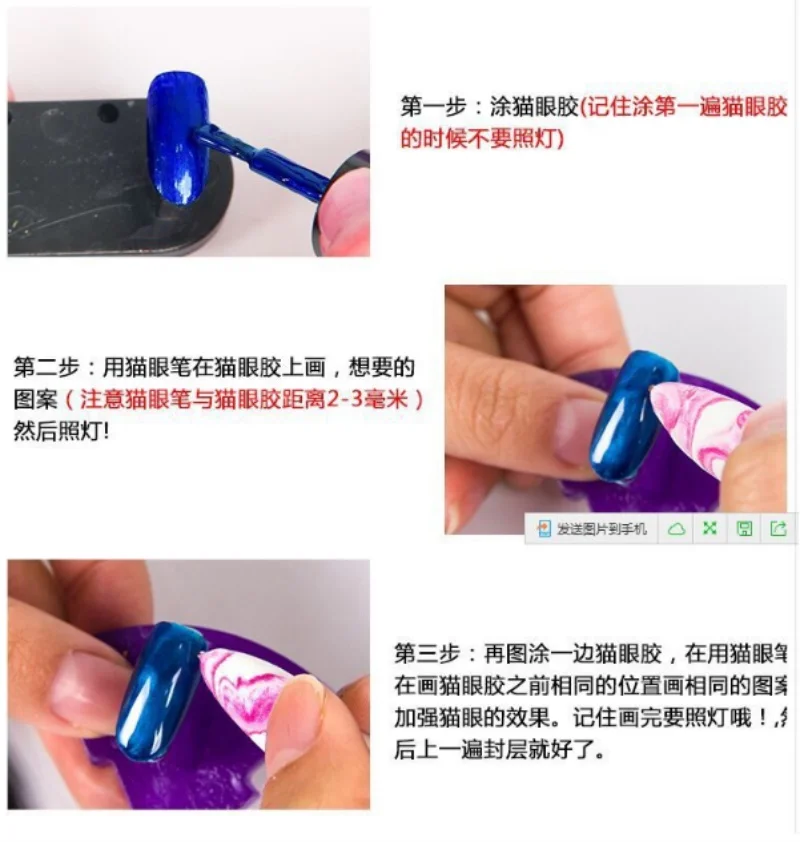 А. раскрасить базовый гель, вылечить 2 минуты со светодиодный подсветкой;В. красить кошачий глаз лак, лечить 2 минуты со светодиодный подсветкой;C. раскрасить кошачий глаз снова, без лечения, используйте магнитик-ручку рядом с гвоздем около 2 мм, рисуйте любой рисунок, который вам нравится, затем появится красивый узор, затем вылечите его прямо сейчас, примерно 2 минуты со светодиодный подсветкойD. Наконец, раскрасить верхнее пальто, вылечить 3 минуты.