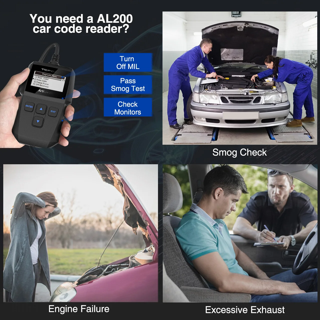 7. Никаких аккумуляторов или зарядных устройств, необходимых для включения считывателя кодов, вы можете напрямую использовать его с питанием от разъема передачи данных OBDII в вашем автомобиле. 8. Есть 4 кнопки на AL200, кнопка вверх/вниз для прокрутки меню. Кнопка ввода и выхода позволяет использовать меню навигации назад и входа.