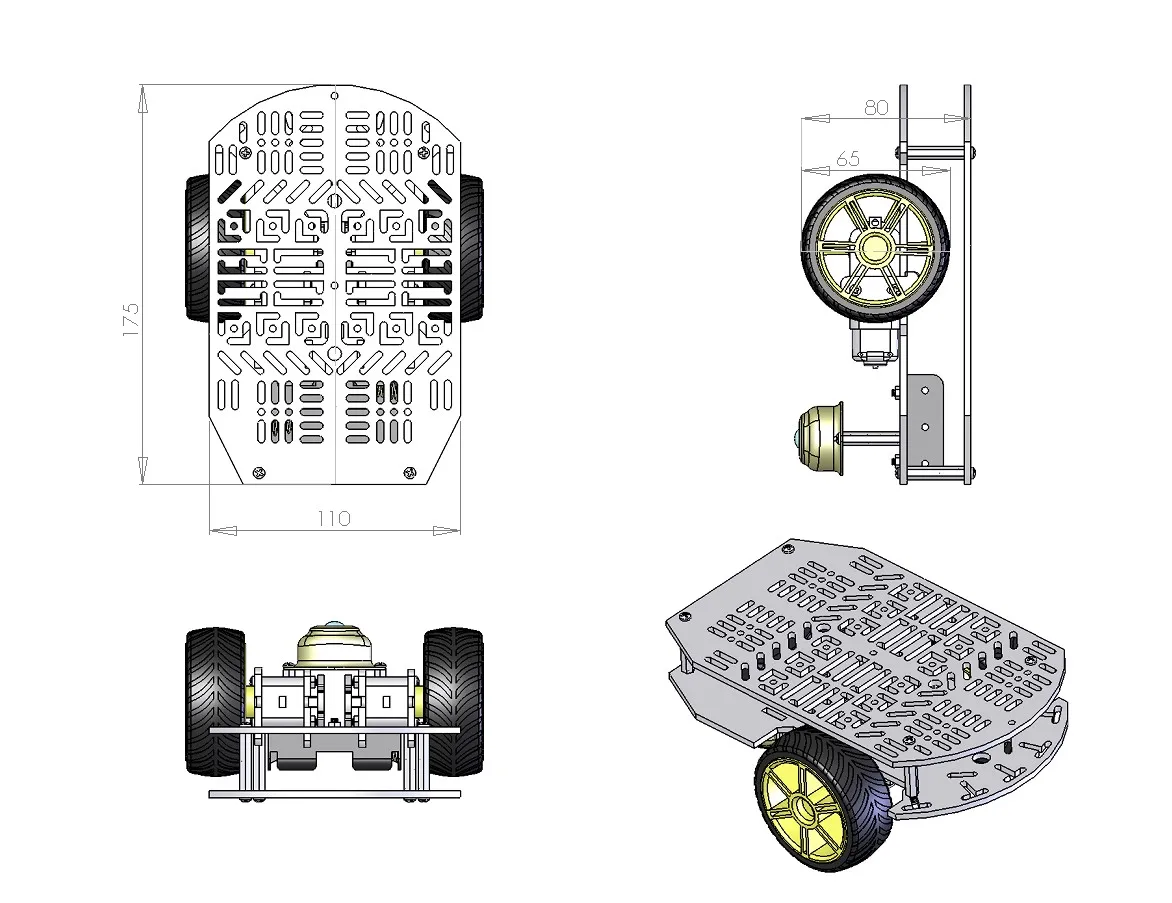 Напряжение: 4,5 V Вес: 280 г Лучшая нагрузка: 400 г Размер: 175*120*80 мм Размер платы: 175*110*80 мм Наружный диаметр шины: 67 мм ширина: 26 мм Размер: первая доска: 45 мм, две пластины расстояние: 24 мм TT Мотор: 4,8 ~ 7,2 Вольт постоянного тока (с EMC с защитой от электромагнитного излучения