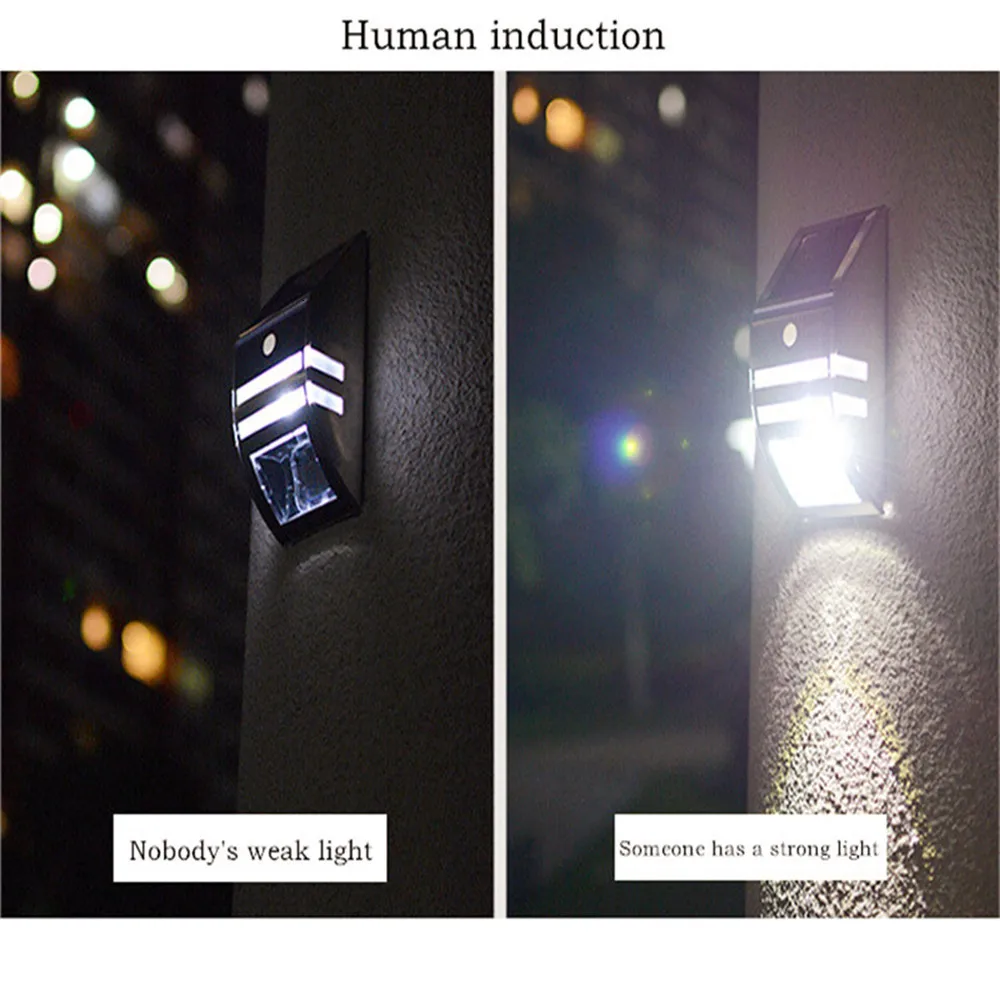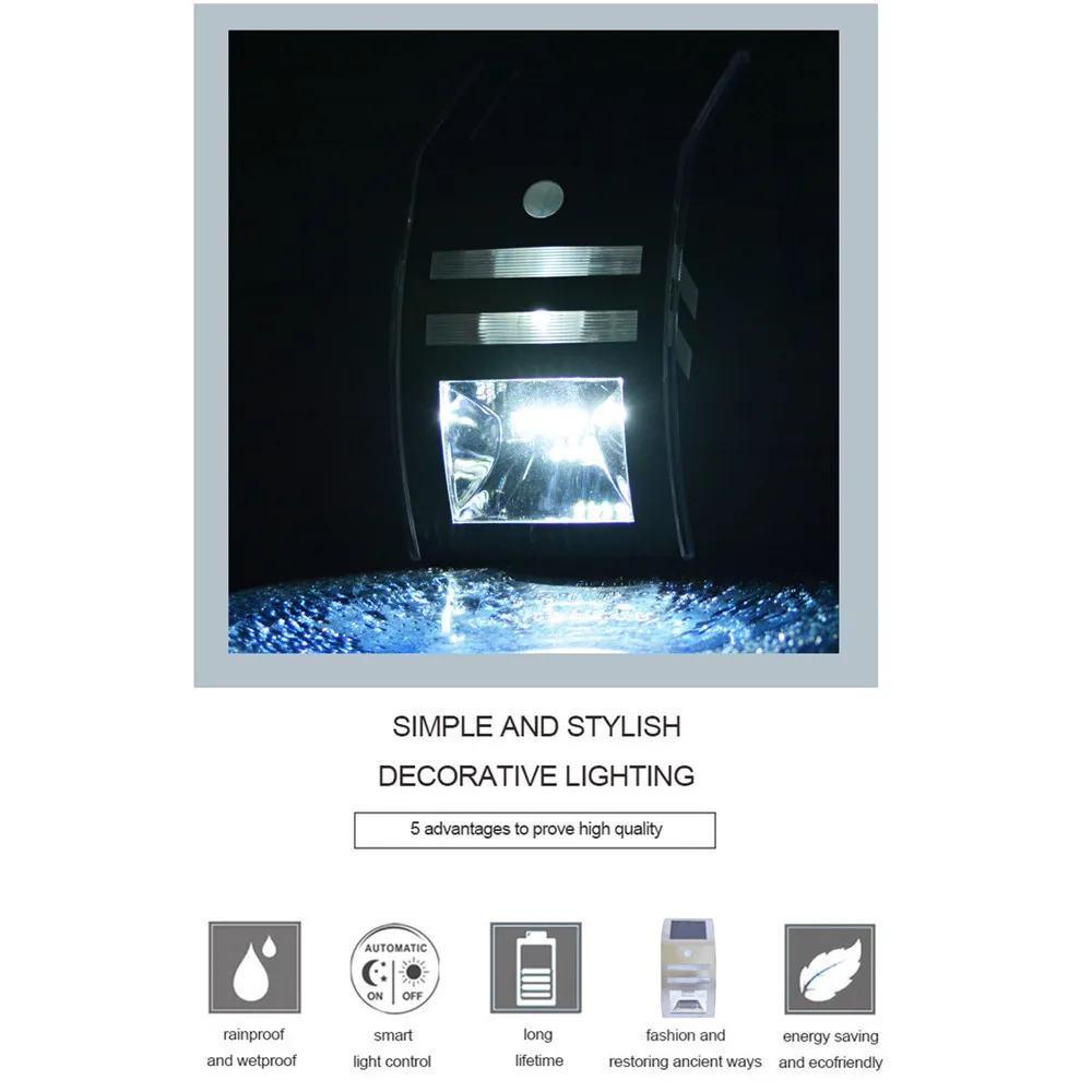 5 шт. встроенных светодиодов, Солнечный настенный светильник, датчик движения PIR, с корпусом из нержавеющей стали, обнаружение движения PIR до 90 градусов и 2 ~ 6 метров расстояния, свет автоматически регулирует яркость в соответствии с окружающим светом, солнечный свет предназначен для использования на открытом воздухе, он может быть подвержен воздействию дождя