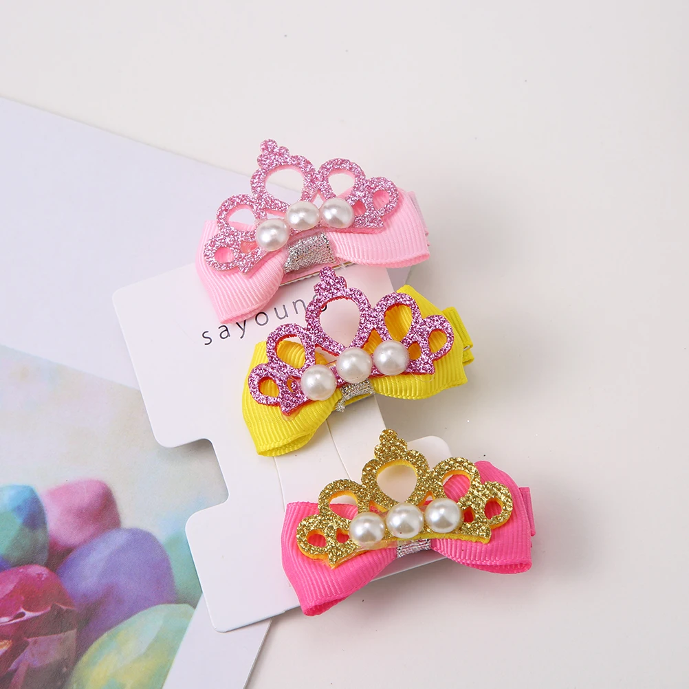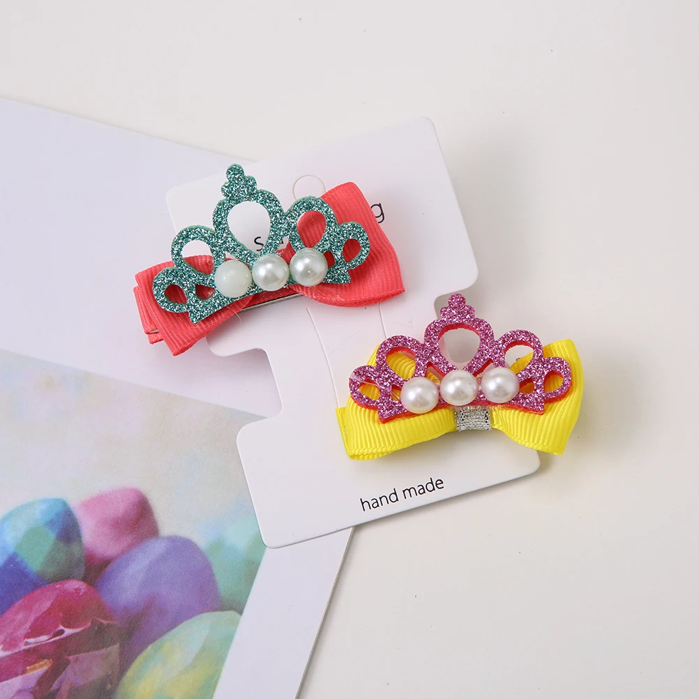 Размер зажима: около 5 см Вес: 4 г Цвет: синий, зеленый, розовый, желтый Количество: 1 шт. Вы можете выбрать цвет, который вам нравится. Новый дизайн, блестящая жемчужная заколка для волос в форме короны, аксессуары для волос для девочек, полый бант, Детские аксессуары, тиара, детские заколки для волос