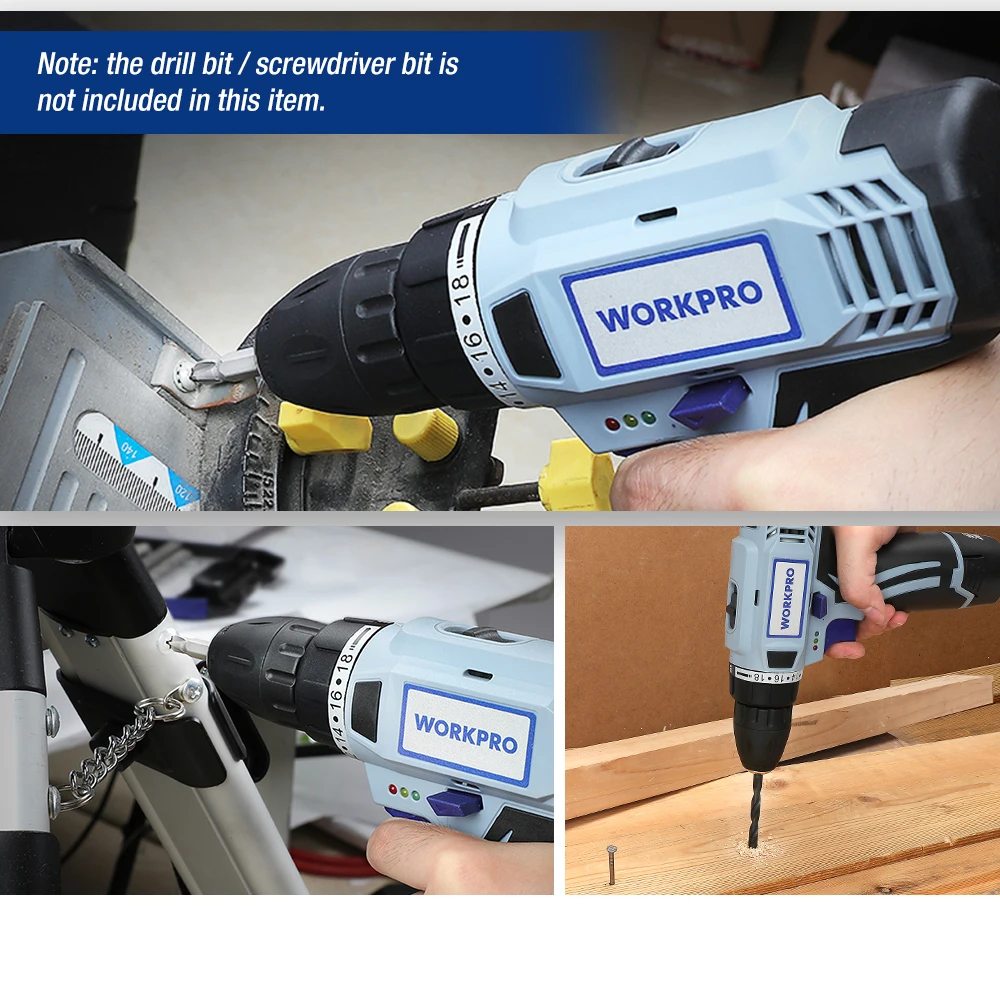 WORKPRO 12V Аккумуляторная дрель электрическая отвертка Мини Беспроводной Мощность драйвер постоянного тока литий-ионный Батарея 3/8-дюймов 2-Скорость