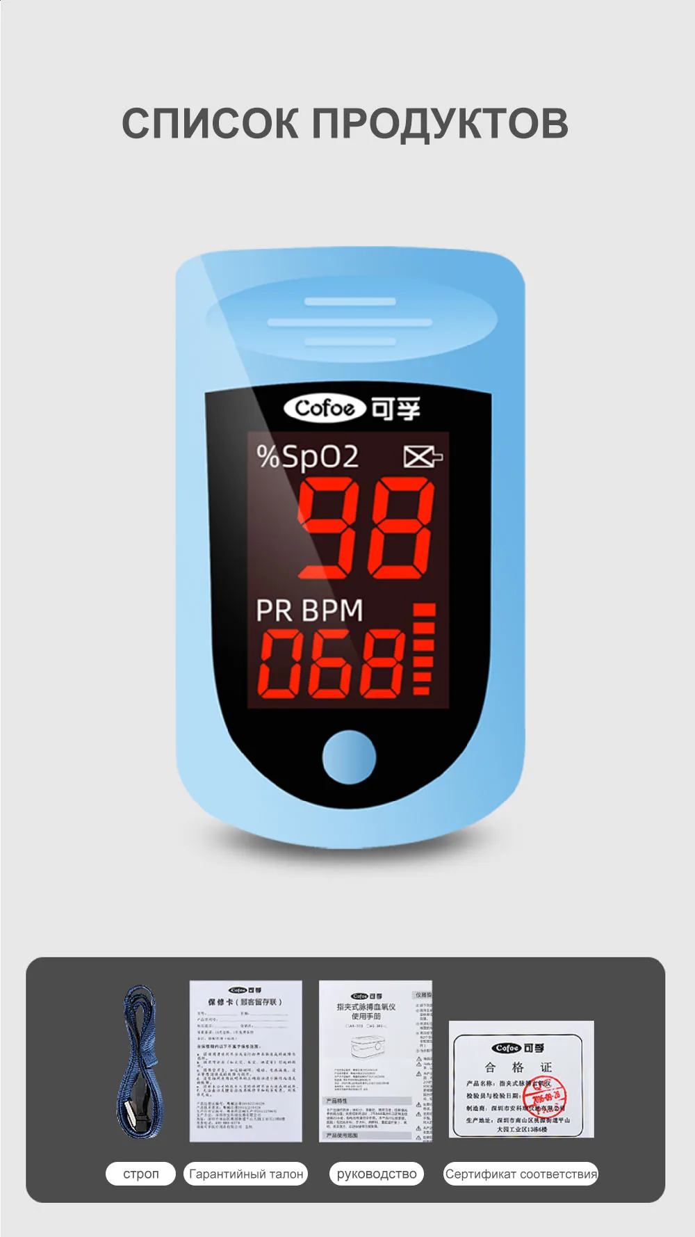 1 * Пальчиковый Пульсоксиметр (батарея в комплект не входит) 1 * ремешок 1 * упаковка 1 * Сертификат утверждения
