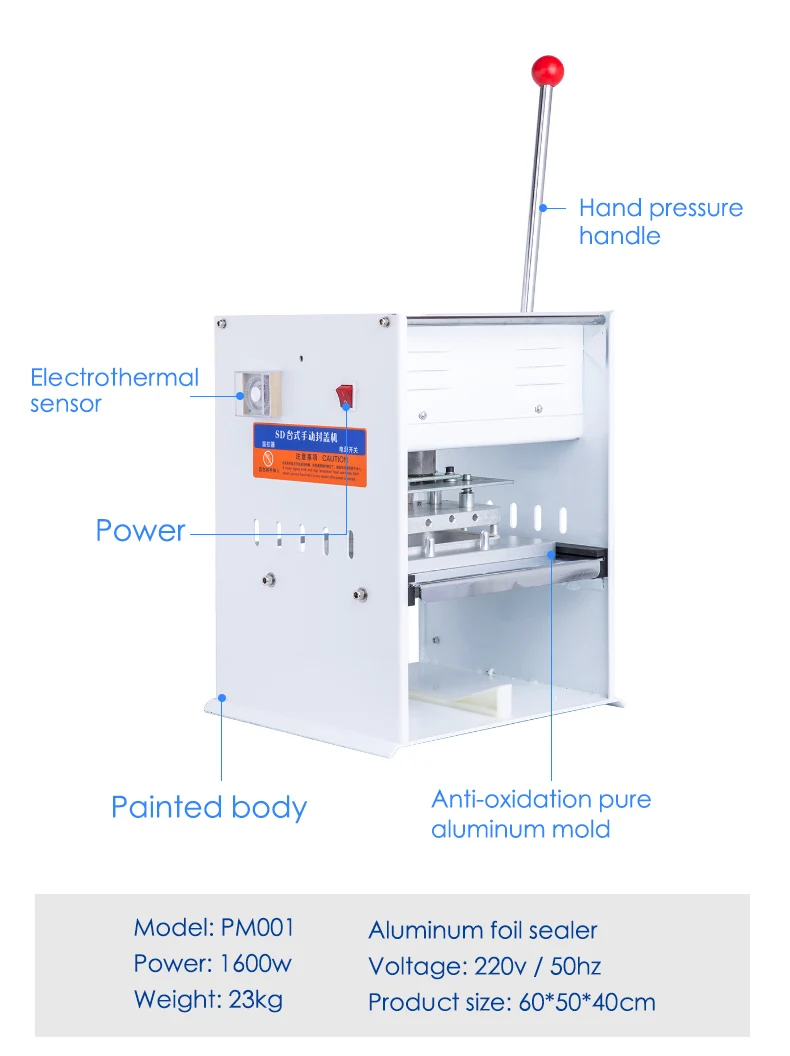 Aluminum foil sealer Model:PM001 Voltage:220v/50hz Power:1600w Product size:600*500*400mm Weight:23kg