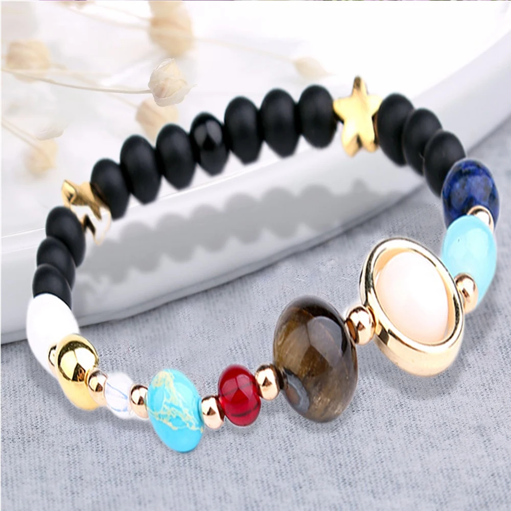 Размер: диаметр бусин: Нептун 8 мм, голубое золото, уран 8 мм натуральный камень Сатурн 10 мм белый камень слоновой кости Jupiter 12 мм тигровый глаз.