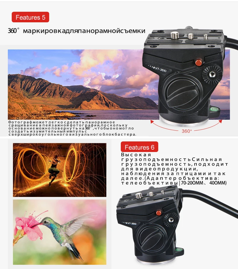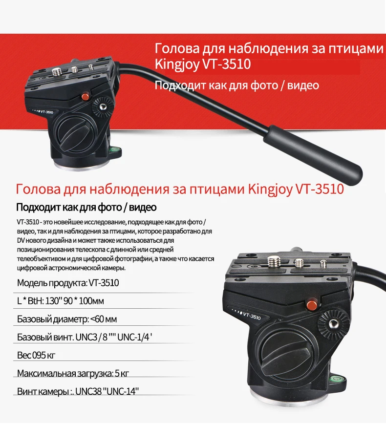 Описание продукта: KINGJOY VT-3510-это инновационная и профессиональная видеоголовка, которая разработана для простого лучшего и идеального решения для HD зеркалок. И он имеет скользящую пластину, которая путешествует, чтобы сбалансировать новейшие камеры со сменным объективом. Он плавно поворачивается на 360 градусов и наклоняется на 180 градусов, а также поставляется со съемным, правосторонним кронштейном и быстроразъемной пластиной 3/8 и 1/4 дюйма. Резьба крепления штатива на нижней части составляет 3/8 дюйма, может быть преобразована в 1/4 дюйма с включенной уменьшающей втулкой для совместимости со всеми штативами.