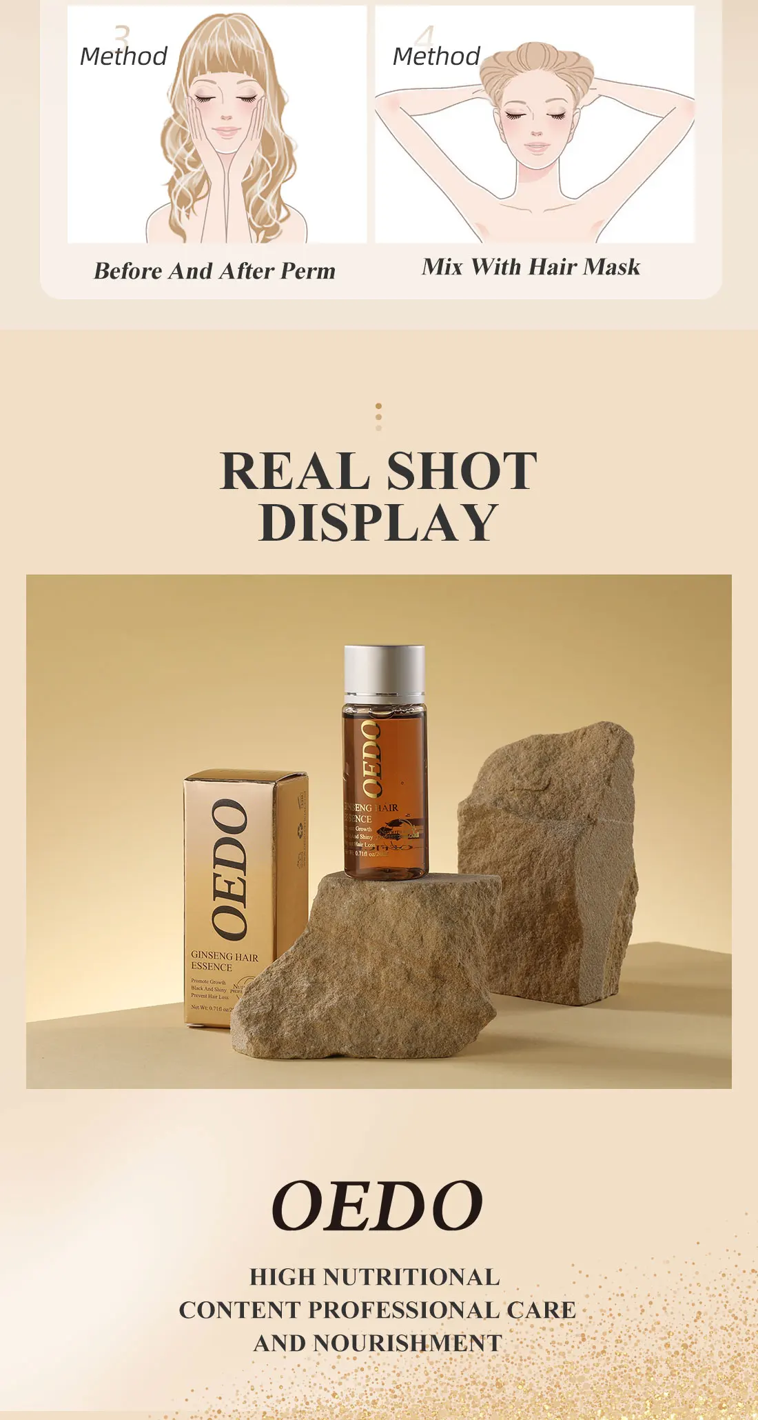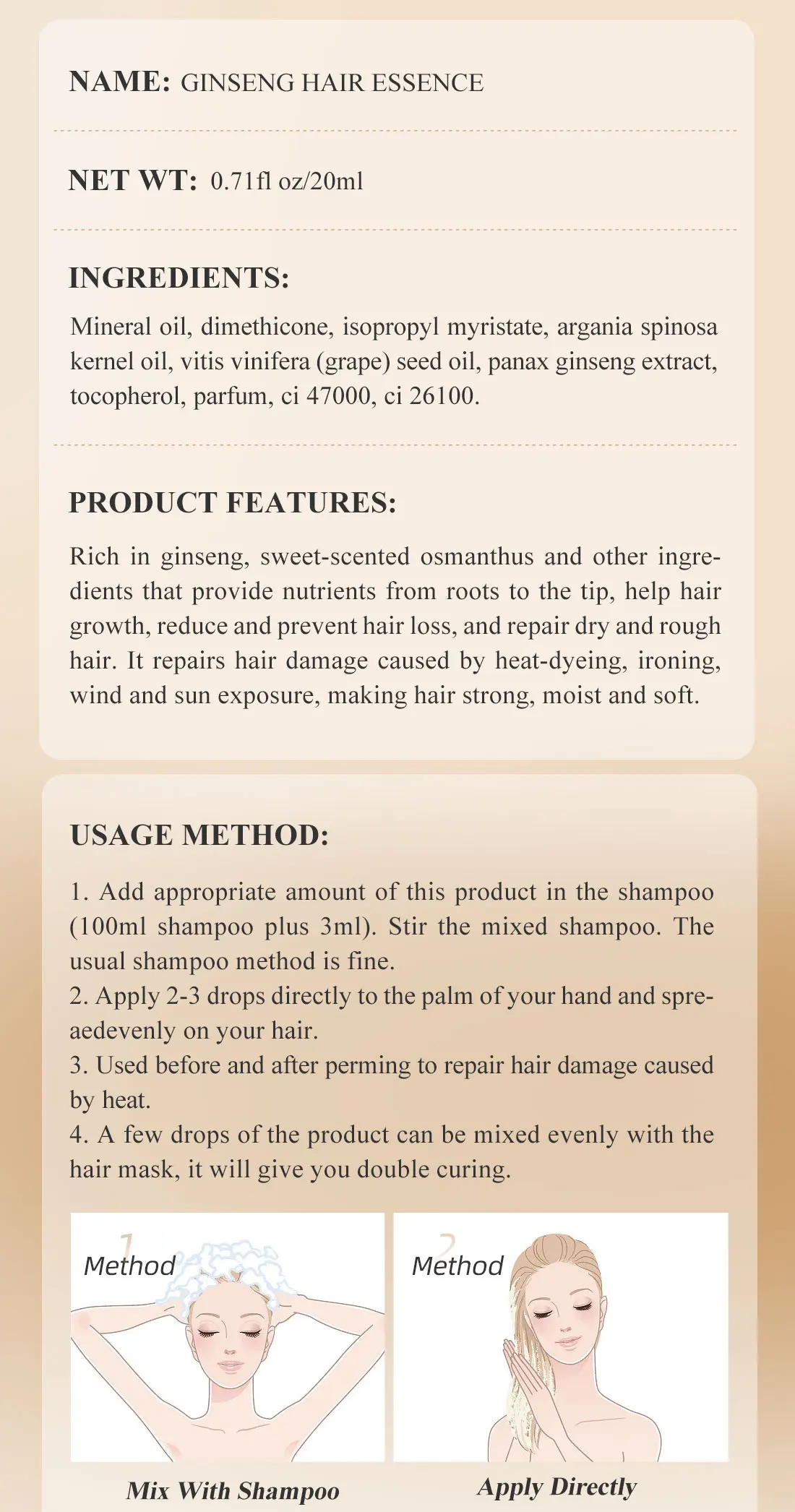 Богатый женьшенем, ароматизированный османтус и другие ингредиенты, которые обеспечивают питательные вещества от корней до кончика, помогают росту волос, уменьшают и предотвращают выпадение волос, восстанавливают сухие и грубые волосы. Он восстанавливает повреждения волос, вызванные тепловым окрашиванием, глажкой, ветром и солнечным воздействием, делая волосы прочными, влажными и мягкими.