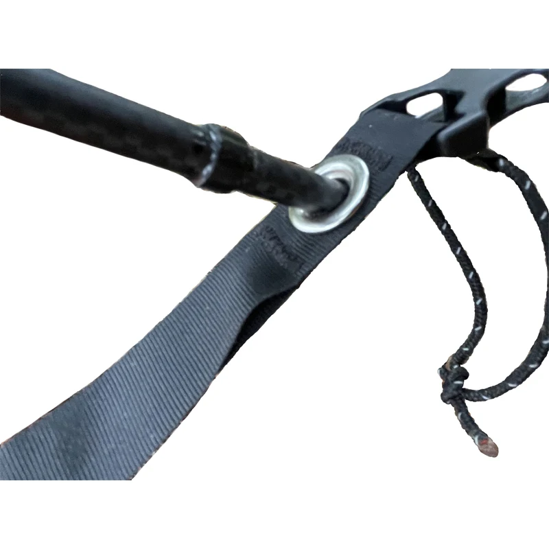 С помощью гладкой пластиковой трубки, обертывающей верхнюю часть колышка палатки, куда крепится веревка парня. Гладкая трубка