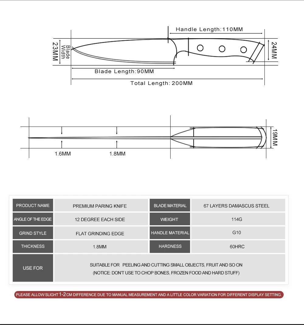 Длина: 200 ммДлина лезвия: 90 ммШирина лезвия: 23 ммТолщина: 1,8 ммИзготовлен из 67-слой дамасской Сталь импортируется из Японии. VG-10 стальной режущий сердечник;