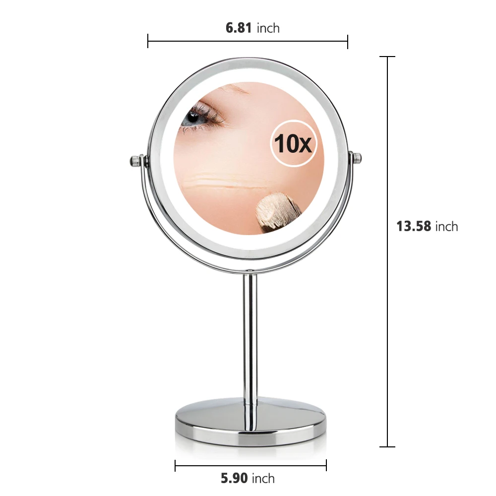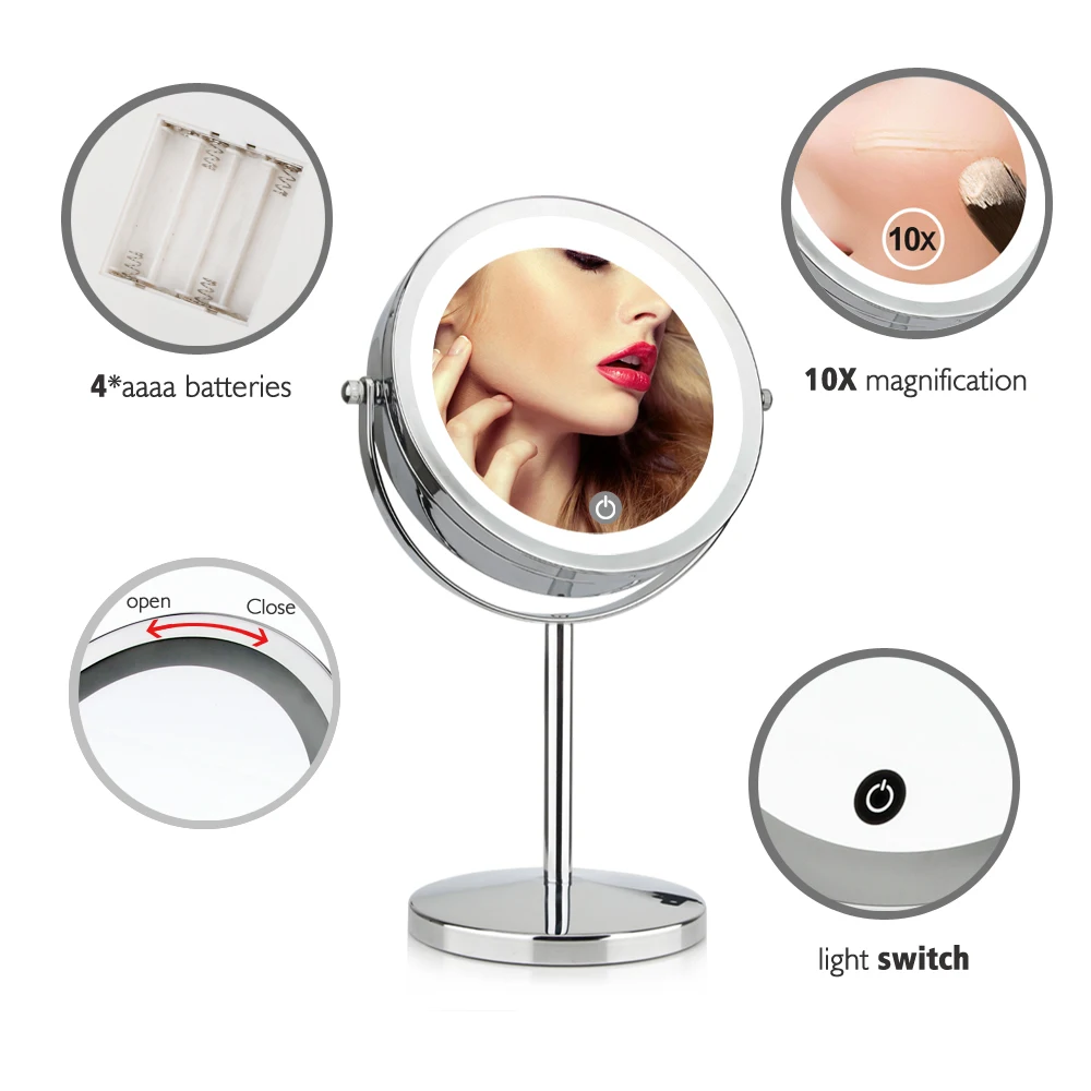 7-дюймовый диаметр полностью зеркала ваше лицо для того, чтобы помочь вам косметика. Зеркало с подставкой обеспечивает превосходное соответствие вашему росту, когда вы сидите. Лупа обеспечивает 10-кратное увеличение для тщательного макияжа. Круглая форма и двухсторонний дизайн, более компактный и более красивый. Non-slip база держит зеркало надежно крепится на письменный стол. 17 светодиодов освещают свет, делают зеркало легче.