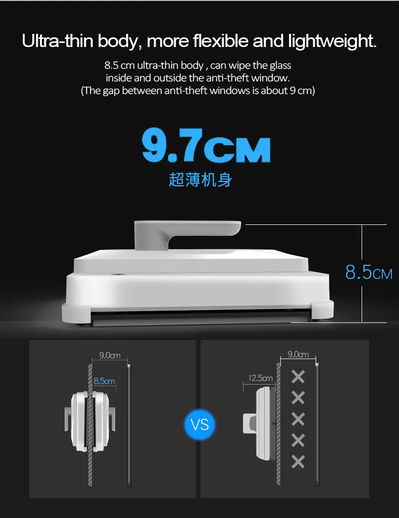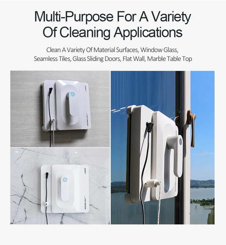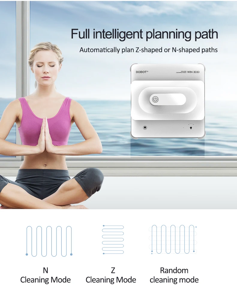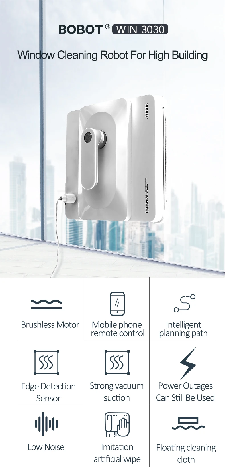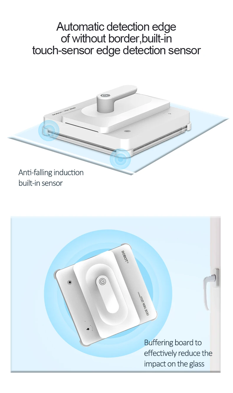 Размер машины: 25 × 25 × 8,5 см Размер подарочной коробки: 35*14*27 см Вес нетто: 1,35 кг Вес брутто: 3,5 кг Емкость аккумулятора: 650 мАч Время зарядки: 1 час Уровень шума: около 65 дБ Сила всасывания: 2500 Pa Номинальное напряжение DC 24 V DC Номинальная мощность 75 Вт В комплект входит: 1 основной блок, 1 адаптер, 1 удлинитель, 1 пульт дистанционного управления, 1 x Веревка безопасности, 4 x коврик для чистки, 1 x руководство пользователя на английском языке BOBOT робот мойщик окон WIN3030 основные функции Управление приложением через систему IOS/Android/пульт дистанционного управления Подходит для бескаркасных стекол/для оконных стекол толще 6 м Встроенный ИБП (автономная система питания) Антипонижающий контроль/автоматическое определение краев окна Ткань из микроволокна не вредит вашему стеклу Работает на нескольких поверхностях очков, плитки, гладких стен и столов Удлинитель питания: 4,0 м/длина веревки безопасности: 4,0 м
