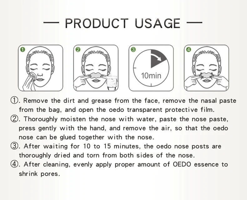 1. Используйте после чистки, намочите нос и держите нос влажным (вы можете нанести горячее полотенце на нос заранее, чтобы открыть поры). 2. Удалите носовую пасту из защитной пленки и прикрепите ее к носу 3. При использовании. Сначала между мостом носа, а затем приклеивается с обеих сторон, аккуратно прижмите ламинатор, обратите внимание на носовую палку между носом и не оставляйте пузырьков (особенно в положении носа много черной головы, и ее нелегко приклеивать). 4. Подождите 10-15 минут, носовой столб медленно высыхает из обеих сторон носа, а затем нанесет продукты, которые уменьшают поры после очищения.