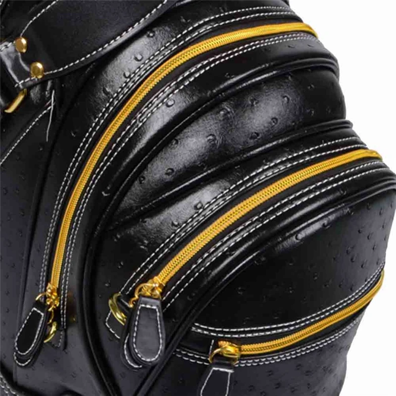 1)it made of high-quality PU artificial leather,tough,durable and Resistance to dirty. 2)the bag with 5 hole design,can be installed 13 clubs,let you in a veriety of venues for the right club use. 3)bag handle made of leather,high-end confort,metal signs,noble quality assurance. 4)the foundation uses the high quality injection molding engineering plastics,packet bring stable for the ball. 5)easy to carry an umbrella.