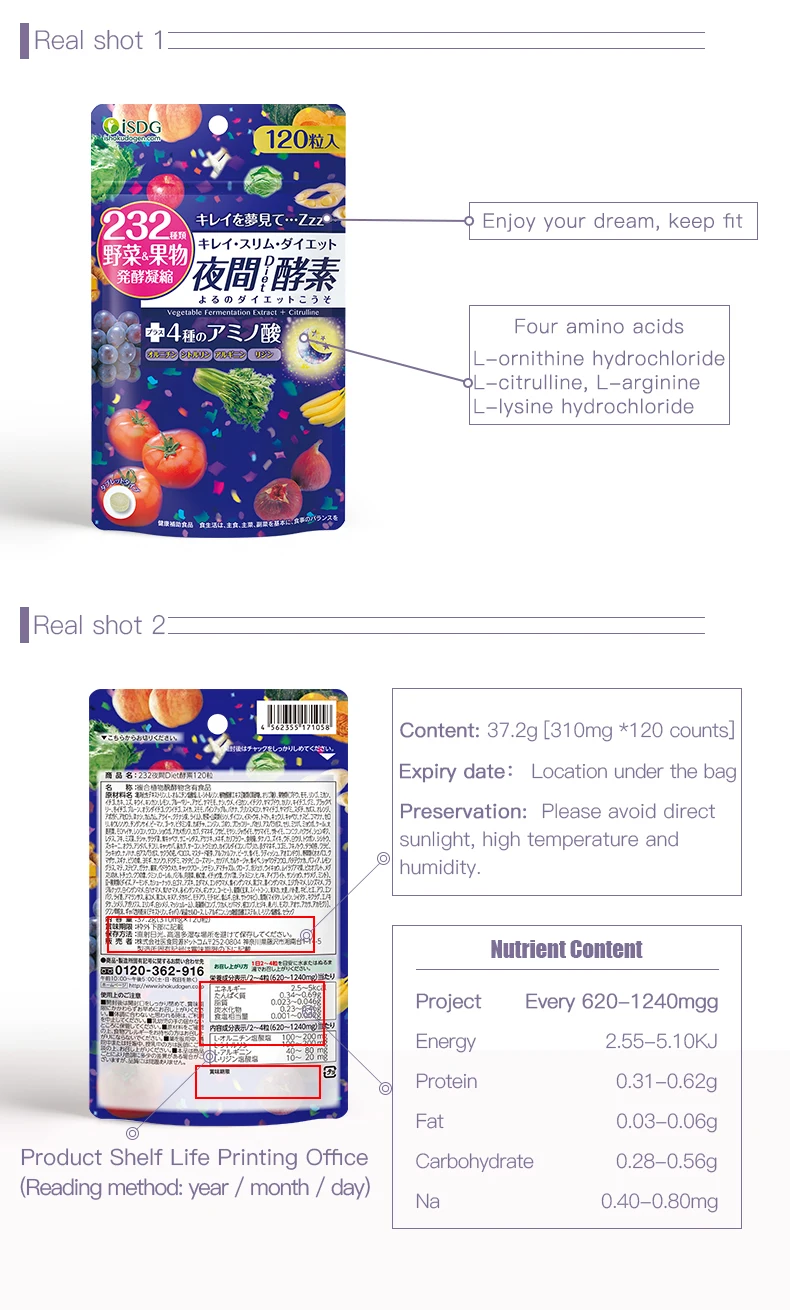 (Производство) Япония (Функции) Улучшает состояние сна и пищеварение с помощью натуральных ингредиентов. Сохраняет форму тела во время сна. 【Direction】 Ночной фермент: Принимайте 2 таблетки в день с теплой водой перед сном. Золотой фермент: Принимайте 2 таблетки перед завтраком и обедом. (Срок годности) 2023 (Состав) Ночной фермента: -232 натуральные овощи и фрукты Повышает роль аминокислот, способствует метаболизму человека. -Л-лизин: аминокислота, необходимая организму человека, которая играет важную роль в процессе синтеза белка в организме человека, является важным компонентом синтеза л-карнитина. -Орнитин Стимулирует рост мышц, костей и обмен веществ. -Аргинин Преобразует излишки жира в мышцы при активных тренировках. -Цитруллин Избавляет от лишних веществ в организме. Золото фермента: 1,232 натуральные овощи и фрукты Повышает роль аминокислот, способствует метаболизму человека. 2. Форсколин: это прямой активатор аденилатного циклазы, который поднимает уровни аденозинового циклофосфата, который, в свою очередь, уменьшает увеличение веса, потребление еды и накопление жира, что делает вас более стройным. 3. Шелковица: шелковица известна как "Третий поколение фруктов", в основном для антиоксидантных, антивозрастных, способствует росту mainly клеток, предотвращает склероз сосудов, сахар в крови и липидную регуляцию. 4. Gymnema:Gymnema может замедлить потребление еды, Это природный жировой формирующий сырьевой материал; Ложка ротанговой кислоты может улучшить чувствительность инсулина, чтобы повысить секрецию инсулина, замедлить сахар, тем самым играть гипогликемический эффект. 5. Salacia: стимулирует гидролиз жира в теле, чтобы осуществить снижение жира. 6. Китайский каштан: каштан содержит богатые волокна, галлиновую кислоту, катехин, может эффективно защитить печень, способствует липидному метаболизму в теле, снижает уровень жира в крови, но также имеет эффект усиления памяти, сопротивляясь забывчивости. (Кто может принимать) подростки, взрослые, люди среднего возраста. (Противопоказания) Если Вы беременны, кормите грудью или имеете какое-либо заболевание, пожалуйста, проконсультируйтесь с Вашим врачом, до того, как начнёте приём. Пейте больше воды во время курса приёма, так продукт усвоится лучше. Не употребляйте кофе или чай во время приёма продукта. 4. Тот факт, что пищевая добавка, которая оказывает воздействие не может сравниться с медицины так, как правило, требуется 1-2 месяца для нашего организма, чтобы впитать в дополнение, а затем оказать эффект.