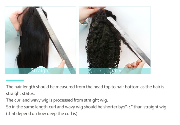Длина волос должна быть измерена от верхней части головы до нижней части волоса, так как волосы имеют прямое состояние. Завиток и волнистый парик обрабатываются из прямых париков. Таким образом, в той же длине, завиток и волнистый парик должны быть короче на 1 ''-4'', чем прямой парик (это зависит от того, насколько глубоко завиток)