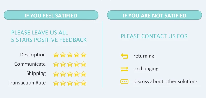 Мы будем признательны, если вы оставите нам все 5 звезд положительные отзывы с фотографиями. Ваш хороший отзыв-это большая поддержка для наших трудолюбивых сотрудников. Если вы не удовлетворены, пожалуйста, не открывайте спор или не оставляйте негативные отзывы. Свяжитесь с нами вовремя, мы постараемся сделать все возможное, чтобы работать с вами вместе, чтобы решить любую проблему, пока вы не будете удовлетворены.