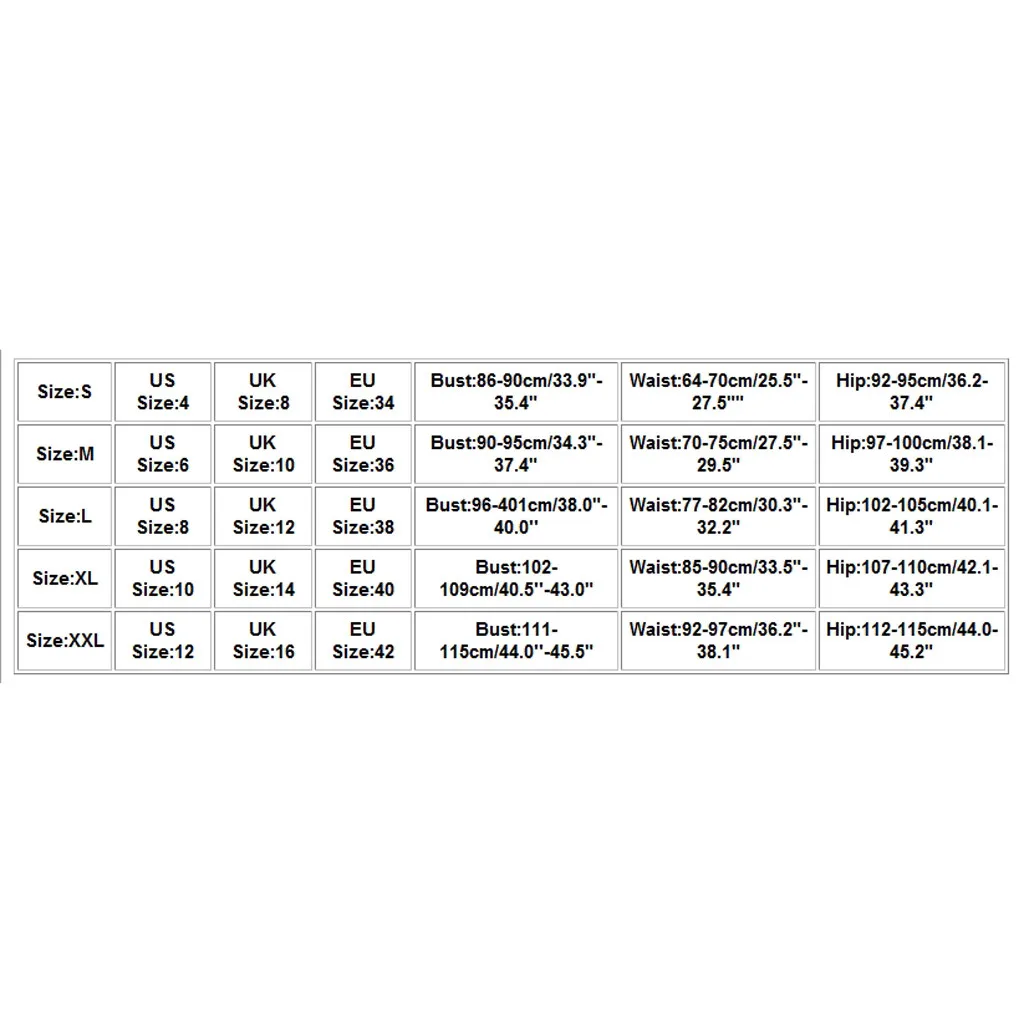 Пожалуйста, учитывайте разницу в 1-3 см из-за ручного измерения, спасибо (все измерения в см и обратите внимание, что 1 см = 0,39 дюйма)Пожалуйста, сравните размеры детали с вашими перед покупкой!Цвета могут немного отличаться в зависимости от настроек компьютера и монитораРазмеры таблицей: РазмерНам РазмерыUK РазмерыЕС РазмерыОбхват грудиОбхват талииОбхват бедерS483486-90 см/33,9 "-35,4"64-70 см/25,5 "-27,5"92-95 см/36,2-37,4"М6103690-95 см/34,3 "-37,4"70-75 см/27,5 "-29,5"97-100 см/38,1-39,3"L8123896-401 см/38,0 "-40,0''77-82 см/30,3 "-32,2"102-105 см/40,1-41,3"XL101440102-109 см/40,5 ''-43,0"85-90 см/33,5 "-35,4"107-110 см/42,1-43,3"XXL121642111-115 см/44,0 ''-45,5"92-97 см/36,2 "-38,1"112-115 см/44,0-45,2"