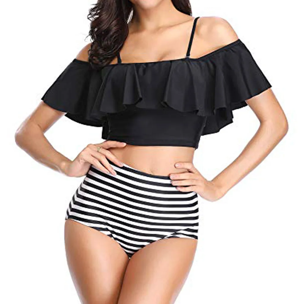 Женский купальный костюм из двух частей, топ с оборками и высокой талией, комплект бикини, танкини, купальник