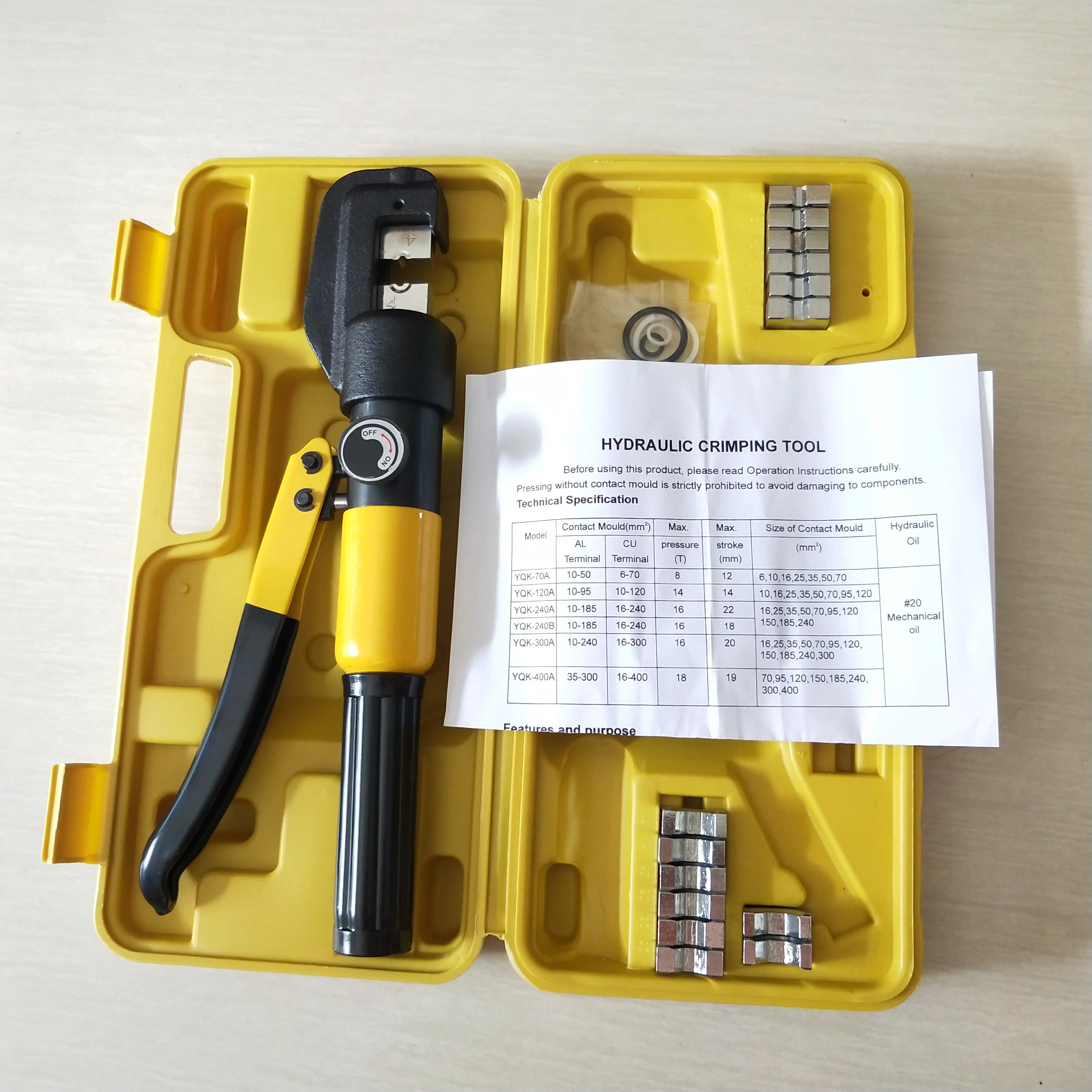 Диапазон обжима: 4-70мм2 Максимальное давление: От 5 до 6 лет Максимальный ход: 10 мм Конфигурация формы: 4,6,10,16,25,35,50,70 мм2 Форма обжима: ограничительное давление Вес: 3 кг/упаковка