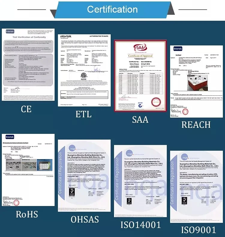 1. Опытные и безопасные гарантии: -Наша фабрика специализируется на производстве гидромассажной ванны с 1995 года, с опытными дизайнерами и инженерами, и более 100 квалифицированных рабочих в нашей команде. -Все ванны изготавливаются строго в соответствии с CE, RoHS, SAA, CSA, GMC, ETL и т. д. 2. Экологически чистый и высокий EER: -Лучшее качество водяных насосов с высоким коэффициентом энергоэффективности. -Одобрение RoHS для всех электронных компонентов. -Корпус ванны изготовлен из американского происхождения, акриловый, здоровый и прочный. 3. Удобное управление: -Все гидромассажные ванны построены-в системе управления США Бальбоа, нагревателе Бальбоа и озоновом стерилизаторе США, легко управлять гидромассажной ванной умным способом, экономьте свое время и деньги. 4. Гарантия и обслуживание: -Каждый продукт прошел тестирование и контроль качества перед отправкой. -Детали гарантии: 5 лет оболочки, 2 года компонентов. -Профессиональная команда предлагает вам лучшие консультации и послепродажное обслуживание.