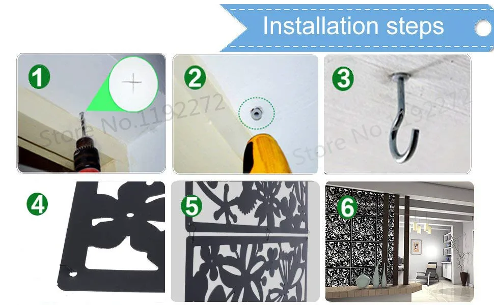 Как украсить ваш домШаг 1: Сделайте отверстия с электрической дрелью на фиксированной точкеШаг 2: наполнитель расширительной трубки в отверстиеШаг 3: закрутите коготь в трубкуШаг 4: Подключение разделителей с зажимамиШаг 5: подвешивание разделителей сверху внизШаг 6: Наслаждайтесь вашим пространством конфиденциальностиПримечание: Если вы не хотите просверливать потолок, подвешивание экранов с помощью клейких крючков/липких настенных крючков также является очень хорошим способомНе только разделитель комнаты:Как экран панели: делает вашу столовую более элегантнойКак разделитель комнаты: делает вашу гостиную более многослойной, например, поместите ее в середине гостиной и столовойВ качестве офисного занавеса: можно свободно разделять пространствоЧасто задаваемые вопросыВ: как они висят с потолка? Что их удерживает?О: все включено в посылка. Он поставляется с крючками, от которых вы их повесили. Вам нужно просверлить отверстия в потолке, вставьте шпильки (также входят в комплект), а затем вставьте крючки в шпильки.В: могут ли они быть установлены без сверления?О: Да, они могут. Если Твердые крючки используются для прикрепления к потолку, например, крепкие клейкие крючки/Липкие настенные крючки, они отлично работают.В: какие измерения на квадрат? Мне нужна эта информация, чтобы я мог измерить ее против стены, чтобы решить, сколько комплектов нужно купить.О: каждая панель 15,7x15,7 дюйма, 246 квадратных дюймов и есть как 12 панелей в упаковке, это зависит от высоты комнаты и того, насколько далеко стены, которые вы пытаетесь соединить друг с другом.Что вы получаетеПодвесные экраны (12 шт.)Стальное кольцоКрючки и расширительные трубки