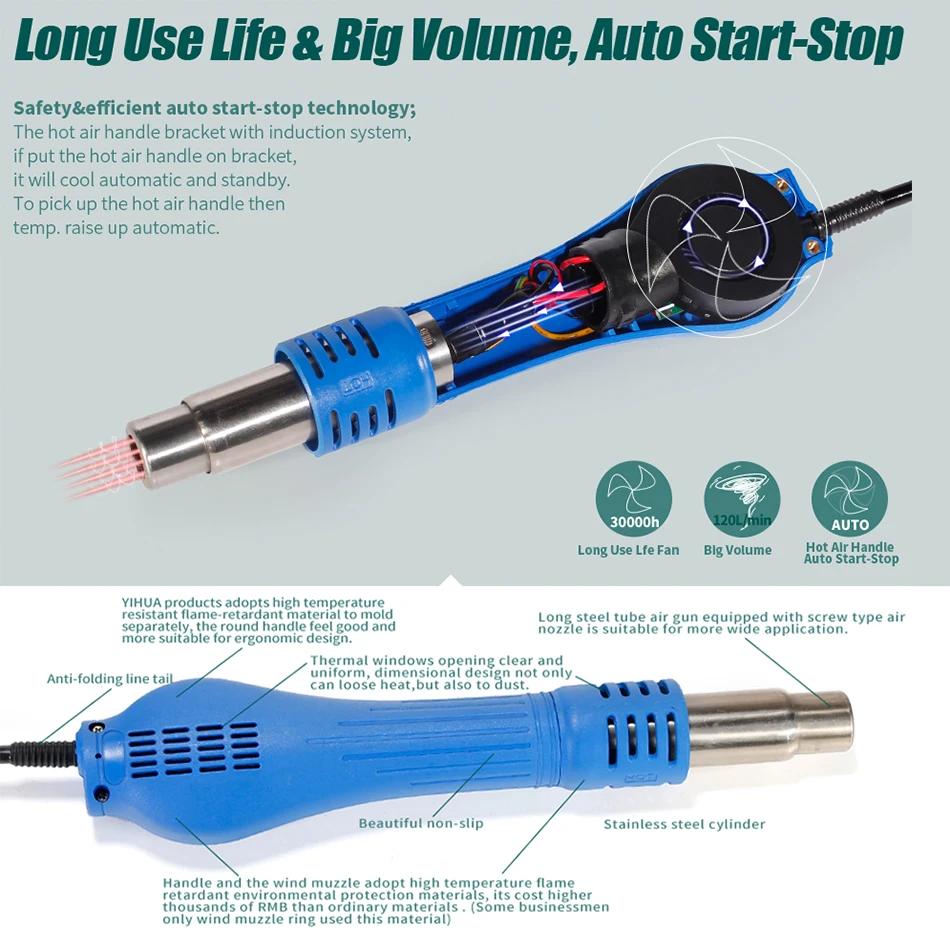 Модель: 909D + Тип: светодиодный микрокомпьютер с цифровым дисплеем Входное напряжение: 220 В/50 Гц (110 В/60 Гц можно настроить) Вес единицы: 4,9 кг Шасси Размеры: 25,6 см (длина) × 18,8 см (Ш) × 17,5 см (высота) Размер коробки: 32 см (длина) × 27 см (ширина) × 20 см (высота) Упаковка: 6 комплектов/коробка Размер упаковки: 57 см (длина) × 35 см (ширина) × 62,5 см (высота) Часть воздушного пистолета Рабочее напряжение: ac220в/50 Гц (ac110в/60 Гц) Потребляемая мощность: 700 Вт Нагревательный элемент: керамический каркас нагревательного сердечника Диапазон температур: 100 ℃ -480 ℃ Форма дисплея: светодиодный цифровой (разрешение 1 ℃) Стабильность температуры: ± 1 ℃ Тип потока насоса: Бесщеточный вентилятор с мягким ветром Поток воздуха: 120 л/мин (максимум) Шум: Менее 45 дБ Длина ручки: 100 см (включая ручки) Железная часть Рабочее напряжение: ac220в/50 Гц (ac110в/60 Гц) Выходное напряжение: AC24V Потребляемая мощность: 60 Вт Нагревательный элемент: A1321 Керамический Нагреватель Диапазон температур: 200 ℃ -480 ℃ Форма дисплея: светодиодный цифровой (разрешение 1 ℃) Стабильность температуры: ± 2 ℃ (без нагрузки) Длина ручки: 100 см (включая ручки) Блок питания Рабочее напряжение: ac220в/50 Гц (ac110в/60 Гц) Максимальная мощность: 45 Вт Выходное напряжение: 0-15 в Ток нагрузки: 0-3A Время восстановления: <100us Пульсационный шум: <1mvrms (виртуальное значение RMS) Температурный коэффициент: <300ppm/℃ Защита пускового тока: > 10% от номинального валу