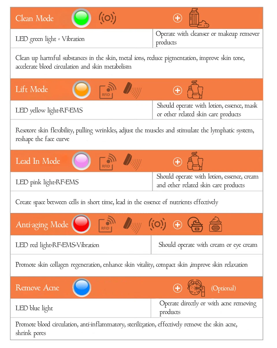 1. Чистый режим (светодиодный зеленый свет + вибрация) * Используйте очищающее средство или средство для снятия макияжа * Очистите вредные вещества в коже, ионы металлов, уменьшите пигментацию, улучшите тонус кожи, ускорите кровообращение и метаболизм кожи * Время работы по умолчанию: 5 минут 2. Режим подъема (светодиодный желтый свет + RF + EMS) * Следует использовать лосьон, эссенцию, маску или другие продукты по уходу за кожей * Резоторная деформация кожи, вытягивание морщин, регулировка мышц и стимулирование лимфатической системы, изменение формы лица * Время работы по умолчанию: 10 минут 3. Свинец в режиме (светодиодный розовый свет + RF + EMS) * Должны работать с лосьоном, эссенцией, кремом и другими сопутствующими продуктами по уходу за кожей * Создать пространство между клетками в короткие сроки, привести в эссенцию питательных веществ эффективно Анти-старение режим * Время работы по умолчанию: 10 минут 4. Антивозрастной режим (светодиодный красный свет + RF + EMS + вибрация) * Следует использовать с кремом или кремом для глаз * Способствует регенерации коллагена кожи, повышает тонус кожи, компактные поры кожи и улучшает Расслабление кожи * Время работы по умолчанию: 10 минут 5. Режим удаления акне (светодиодный синий свет) (работает непосредственно или с продуктами для удаления акне) * Способствует циркуляции крови, противовоспалительной, стерилизации эффективно удаляет акне кожи, сужает поры * Время работы по умолчанию: 5 минут