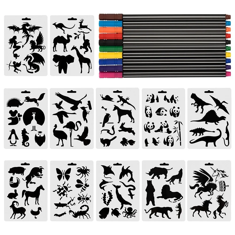 Трафареты животных набор (12 шт) с 10 Fineliner цветной ручкой, пули журнал трафарет шаблон набор, пластиковые шаблоны для рисования, для образования животных, школьные проекты, скрапбукинг, для детских поделок сделай сам