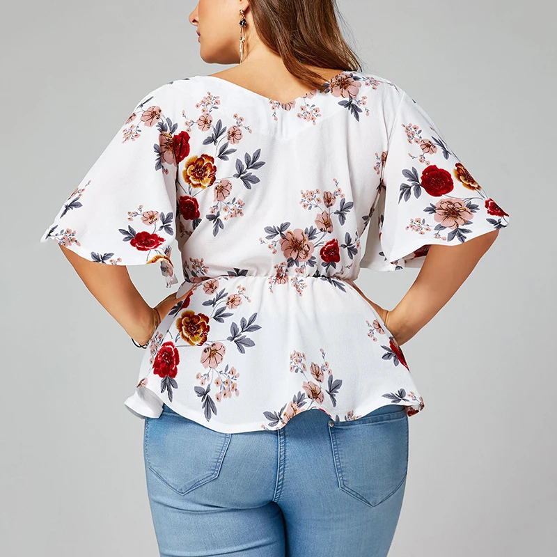* Описание товара: Женская XL-5XL; большие размеры; топ с поясом и баской; блузка с цветочным принтом