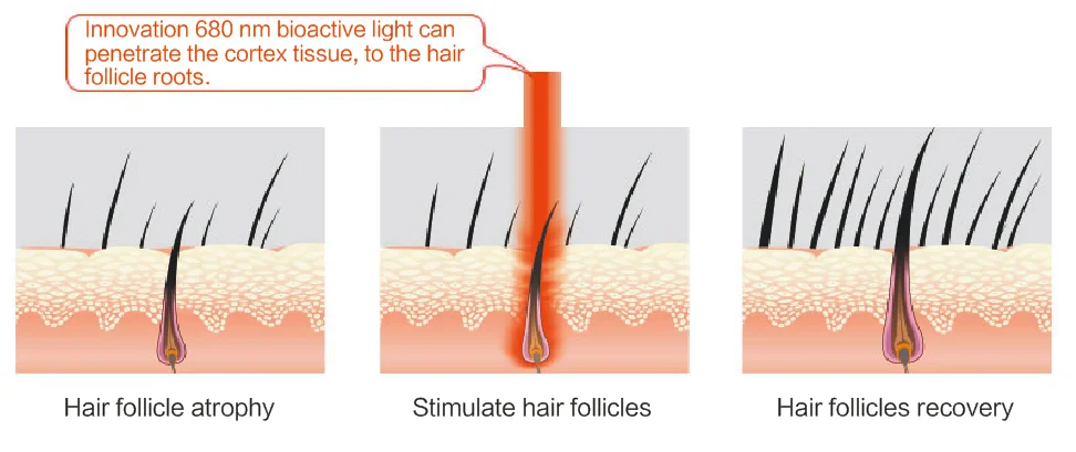Исходя из посылки волосяной фолликул до сих пор нет некроза, активировать волос follicle.680 нм биологически активных позволяя свету проникнуть в клеточки, волосяного фолликула корни достигают Дерма слой, и корни волосяного фолликула богаты меланином, для специфического поглощения 680 нм биологической активности легкой энергии. волосяные фолликулы поглощают достаточную энергию, Синтез протеина ускоряет работу, капиллярный диастолик крови способствует поглощению питательных веществ и кислорода в крови, достижения цели здоровых волос.
