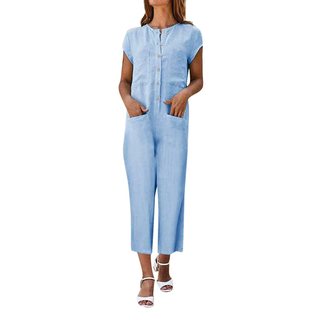 Женский однотонный комбинезон с v-образным вырезом и короткими рукавами, повседневные Комбинезоны с карманами и пуговицами