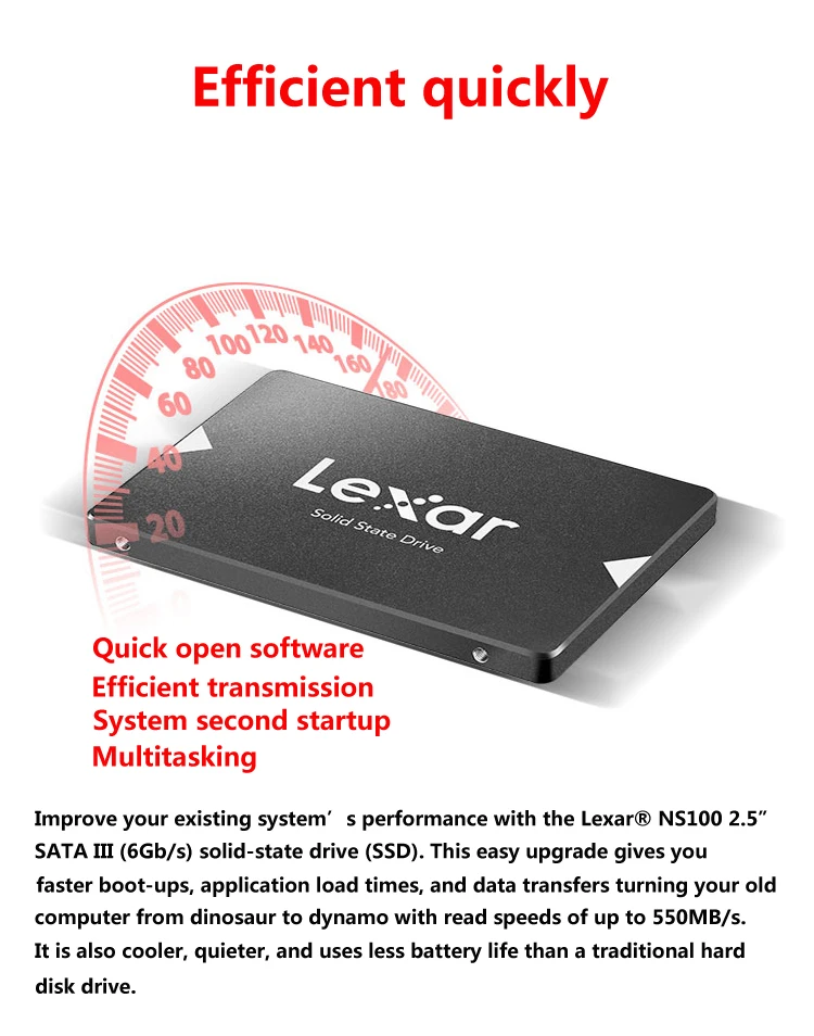 Особенности: 1. Обновите ноутбук или настольный компьютер для более быстрого запуска, передачи данных и загрузки приложений со скоростью чтения до 550 МБ/с./с 2. Более высокая производительность и надежность, чем традиционные жесткие диски 3. Особенности управления программным обеспечением SSD Dash 4. Устойчивость к ударам и вибрациям без движущихся частей 5. Три года ограниченной гарантии характеристики: Цвет: Серый Емкость: 120 ГБ 240 ГБ 480 ГБ 128 ГБ 256 ГБ 512 Интерфейс: 2,5 "SATA III (6 ГБ/сек.) Скорость: 120-240 ГБ последовательного чтения до 520 МБ/с. 480 ГБ последовательного чтения до 550 МБ/с. операционной Температура: 0 °C до 70 °C хранения Температура: -40 °C до 85 °C Ударопрочный: 1500G, продолжительность 0,5 мс, половина Синусоидальная волна, устойчивость к вибрациям: 10 ~ 2000 Гц, 1,5 мм, 20G, 1 Oct/min, 30min/axis(X,Y,Z) TBW: 120GB: 60 ТБ, 240GB: 120 ТБ, 480GB: 240 ТБ DWPD: 120 ГБ: 0,46, 240 ГБ: 0,46, 480 Гб: 0,46 Размер (Ш x В): 100,2 мм x 69,85 мм x 7 мм/2,75 "x 3,94" x 0,28 "Вес: 34g Lexar SSD Dash: Lexar SSD Dash-это удобное программное обеспечение, предназначенное для продуктов Lexar SSD. Он предоставляет актуальную информацию, такую как здоровье привода, состояние привода и статус S.M.A.R.T. [Информация о диске] просмотр информации о вашем диске, включая размер, температуру и интерфейс. [S.M.A.R.T] S.M.A.R.T предназначен для самостоятельного мониторинга, анализа и передачи данных. Позволяет проверить состояние вашего диска. [Обновление прошивки] Эта функция поможет вам обновить ваш SSD, чтобы иметь последнюю версию прошивки. * Примечание: некоторые модели Lexar SSD могут не поддерживать эту функцию. [Жизненный цикл] позволяет узнать, сколько жизни осталось на диске. [Безопасное стирание] навсегда удаляет все данные на вашем SSD. Объем запоминающего устройства: 250 ГБ = примерно 200 ГБ-240 ГБ 500 ГБ = примерно 440 ГБ-490 ГБ 1 ТБ = примерно 880 ГБ-980 ГБ Рынок согласно стандартному определению 1 ГБ = 1,00 миллиард байт, а компьютерное преобразование 1 ГБ = 1,073741824 млрд байт. (Примечание: рыночная Конвертация GB в байты немного варьируется. Google «емкость карты памяти» для получения дополнительной информации.) Скорость исполнения: (различные тестовые программы получат разную скорость, скорость будет зависеть от многих различных факторов, наши данные только в качестве справки) Примечание: 1.результат теста основан на интерфейсе sataIII, sataIII sata кабель, Рабочий стол и SSD пустой статус, различные компьютеры и программное обеспечение (включая версию программного обеспечения), результат может отличаться. 2. Разница между интерфейсом SATA I, SATA II и SATA III SATA I (версия 1.x), официально известный как SATA 1,5 ГБ/сек., является первым интерфейсом SATA, работающим на 1,5 ГБ/сек.. Максимальная скорость 150 МБ/с./с. Интерфейс SATA II (версия 2.x), официально известный как SATA 3 ГБ/сек., является интерфейсом SATA второго поколения, работающим на 3,0 ГБ/сек.. Максимальная скорость 250 МБ/с./с. Интерфейс SATA III (версия 3.x), официально известный как SATA 6 ГБ/сек., является интерфейсом SATA третьего поколения, работающим на 6,0 ГБ/сек.. Максимальная скорость 550 МБ/с./с. Этот интерфейс обратно совместим с интерфейсом SATA 3 ГБ/сек.. Если ssd-накопитель sata3.0 протестирован на скорости интерфейса sata2.0 и кабеля sata, результат будет неточным. 3. В соответствии с международным стандартом 1000 КБ = 1 Мб, реальная емкость = Емкость x 0,93, пожалуйста, обратите внимание на это. Перед использованием, пожалуйста, щелкните правой кнопкой мыши «Мой компьютер-управление-устройство-менеджер-диск» и